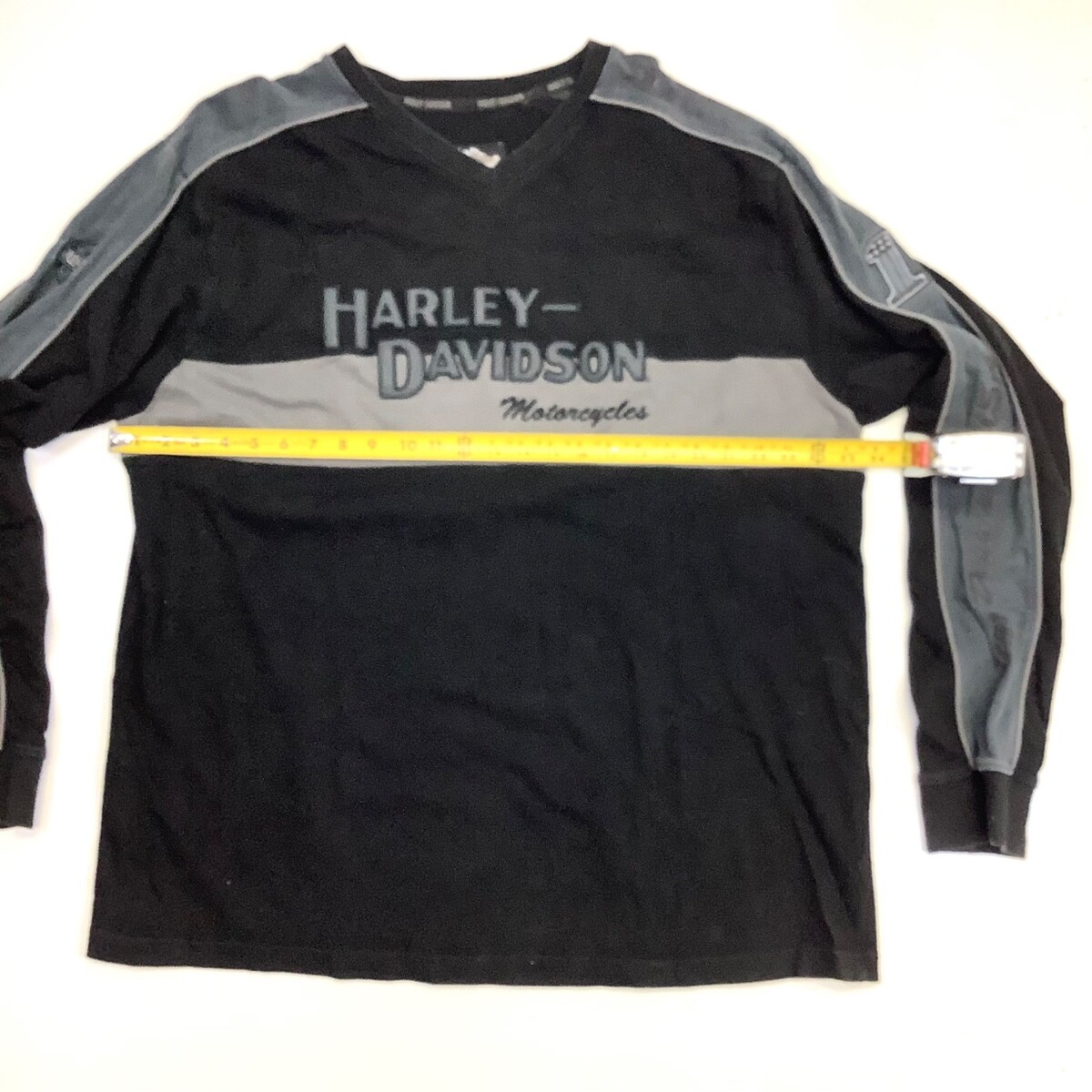 Harley Davidson Embroidered Mens 2XL Pullover Long Sleeve Shirt Black Gray. Shows some minor wear, but overall good condition. Please see all photos. Photos include measurements for armpit to armpit and for top of shoulder to bottom of shirt.