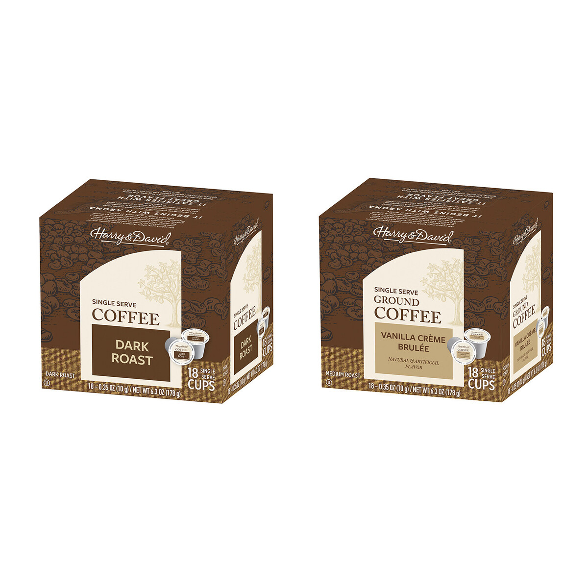 - Harry & David Coffee Combo, Dark Roast-Vanilla Creme Brulee 2/18 ct boxes