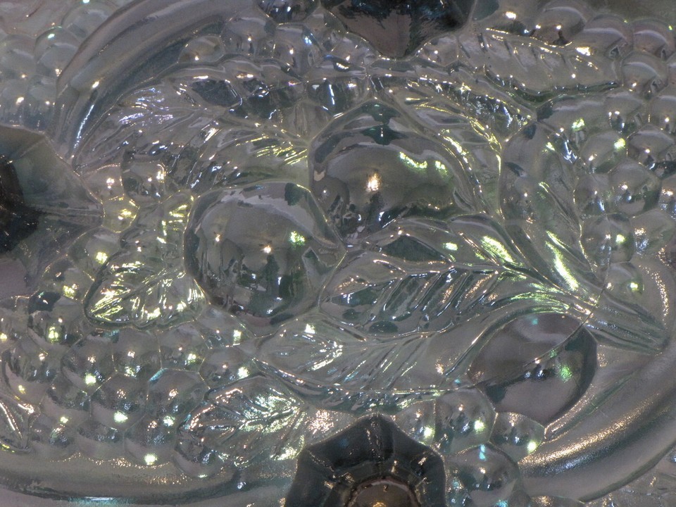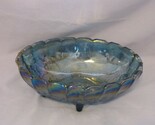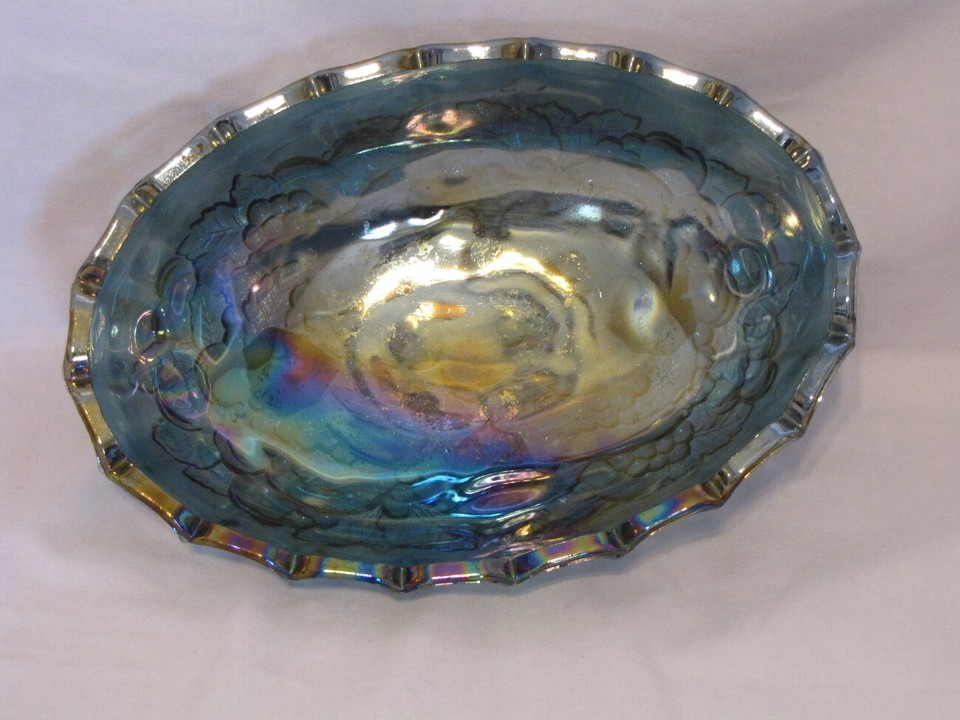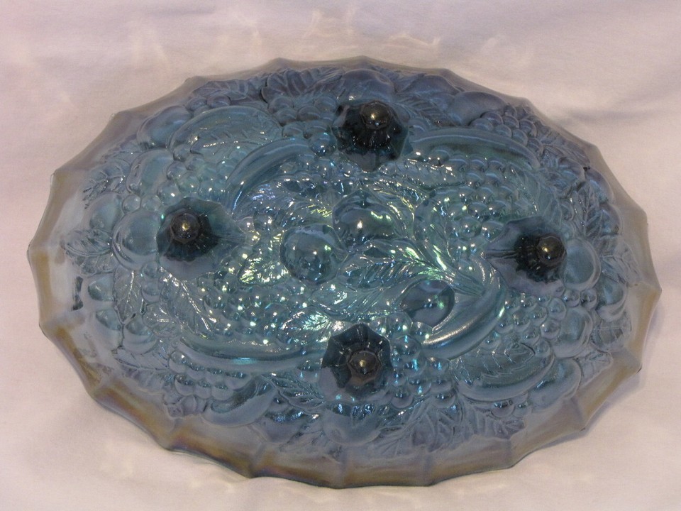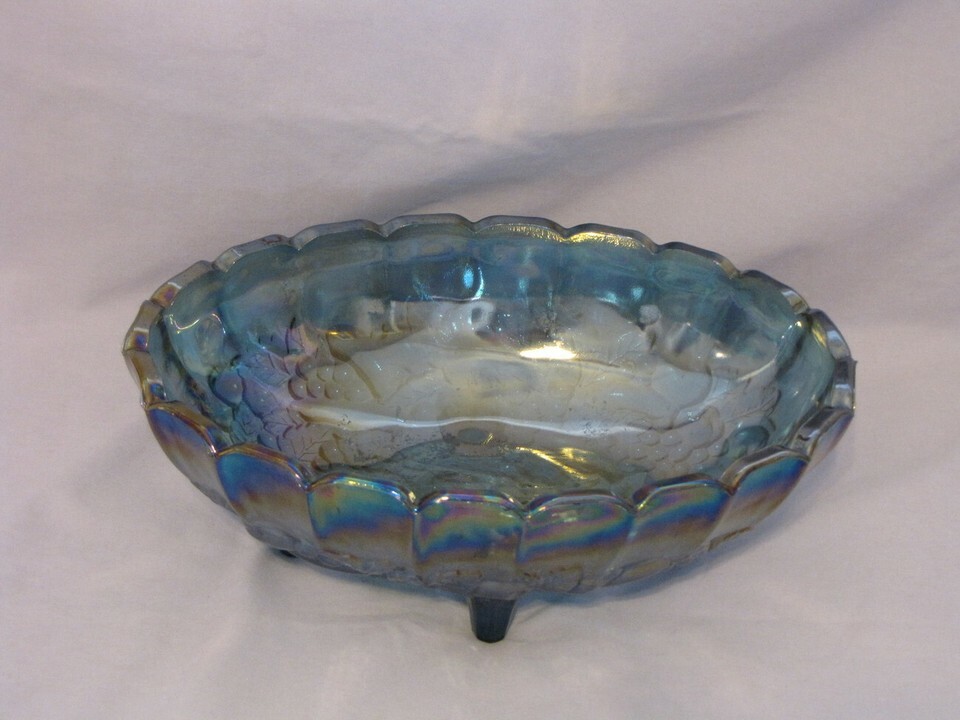 DESCRIPTION: This is a blue carnival glass footed fruit bowl. It has a raised fruit design on the bottom of the bowl. It has a scalloped top edge. Depending on the light, you get blue, purple, gold and green colors.