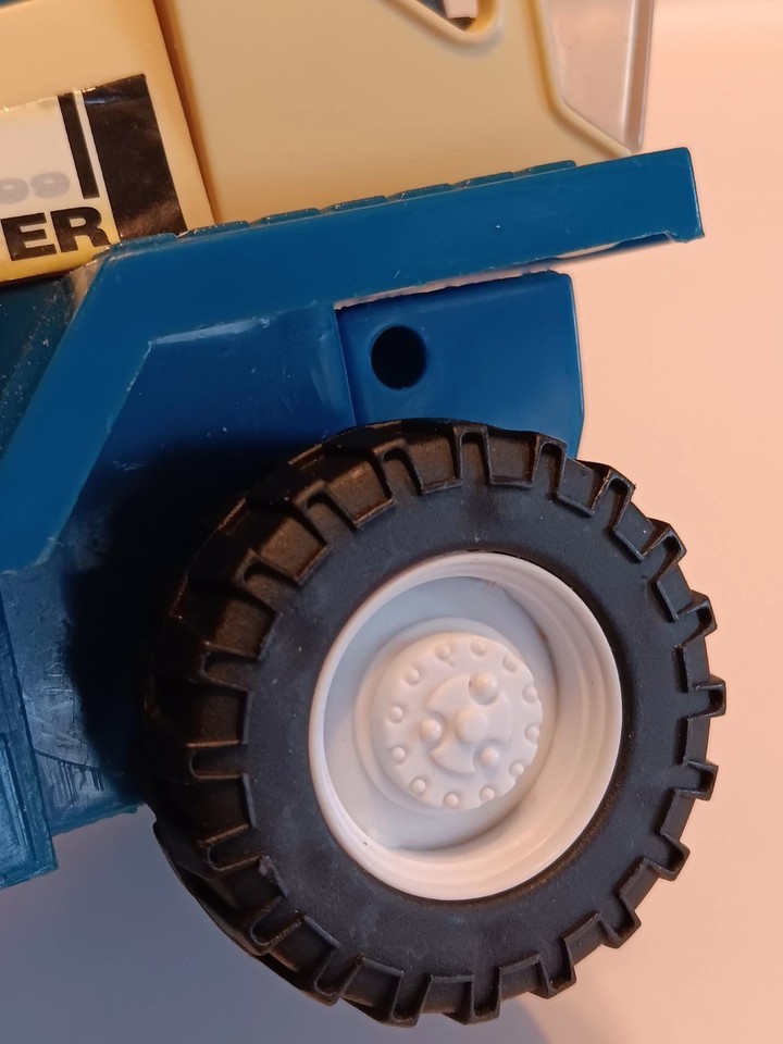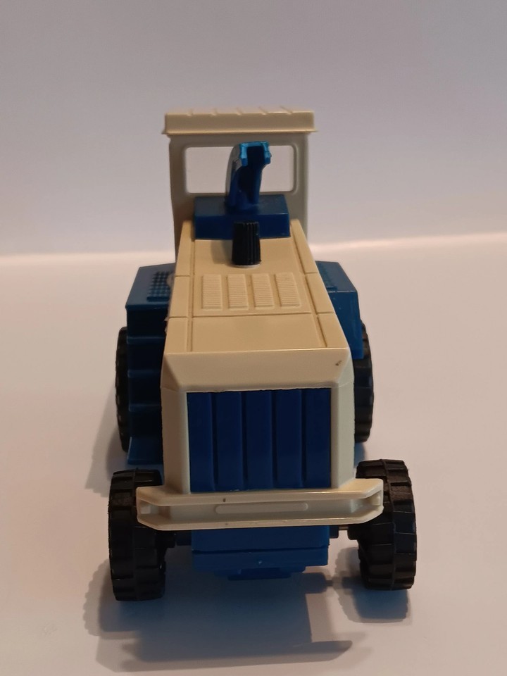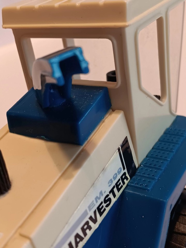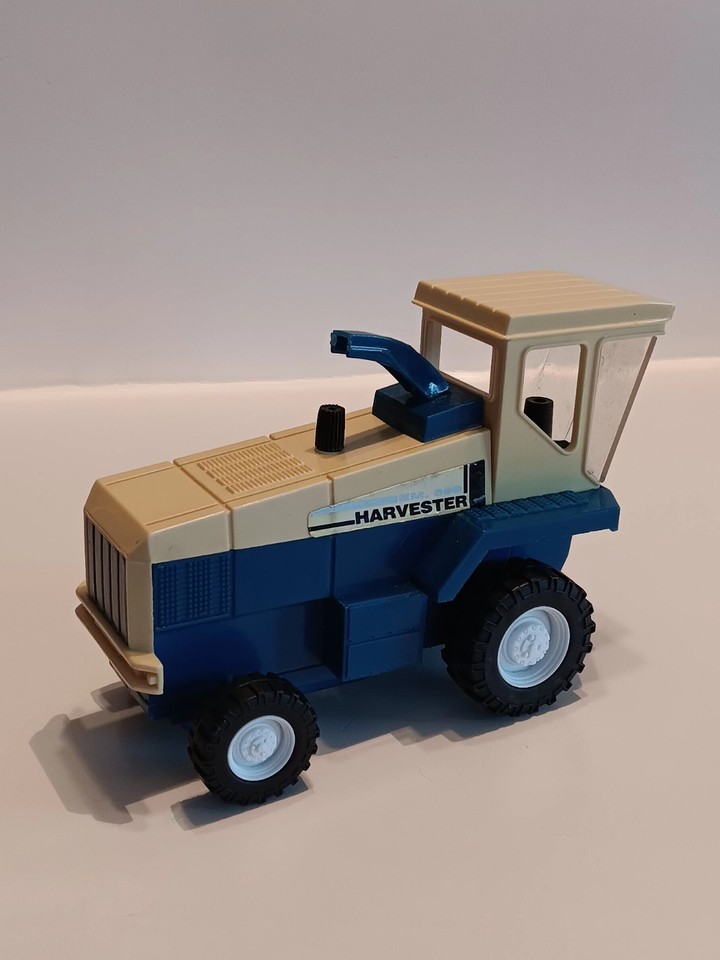 The farm tractor EM. 399 Harvester is a vintage 1990s farm equipment toy made of plastic. It features a blue and white color scheme, indicative of a farm theme. Despite some visible damage, as seen in the accompanying photos and few missing pieces an driver, the tractor still rolls smoothly. Normal wear. All sizes are approximate.