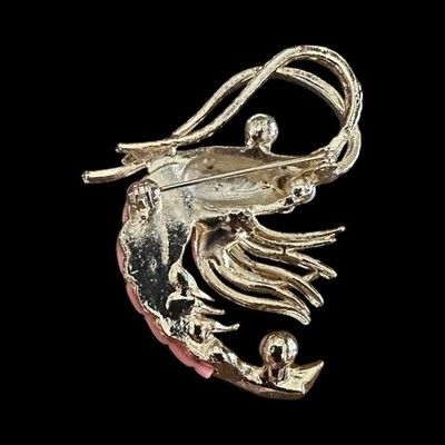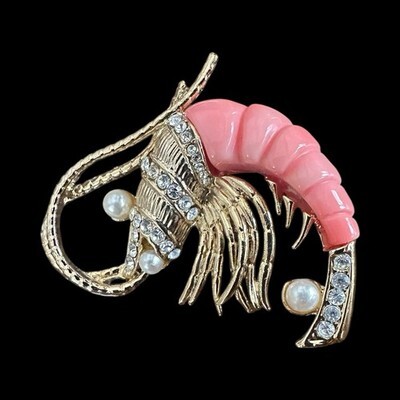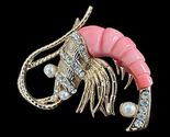 - HATTIE CARNEGIE UNSIGNED LUCITE CORAL RHINESTONE & PEARL SHRIMP BROOCH