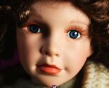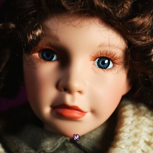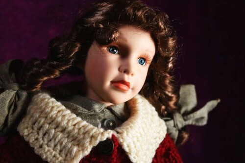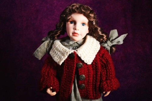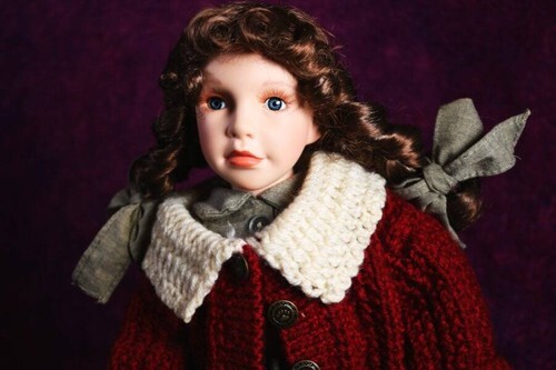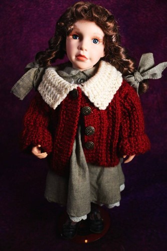 You will be receiving a beautiful porcelain doll. Dryssa is around 14-16 inches tall. Her body is stuffed with her head, neck, arms, and legs are made of porcelain. She has long, wavy brown hair held in pigtails. She has soft blue eyes. And she is wearing a gray dress beneath an oversized red sweater.