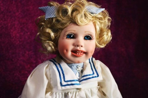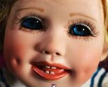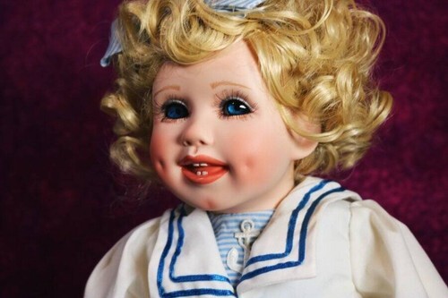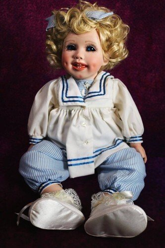 You will be receiving a beautiful porcelain doll. Eesayla is around 12 inches tall in a seated position. Her body is stuffed with her head, neck, arms, and legs are made of porcelain. She has short, curly blonde hair topped with a bow. She has the most striking ocean-blue eyes I have ever seen. She is wearing a white and blue sailor's outfit.