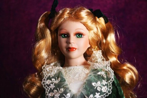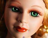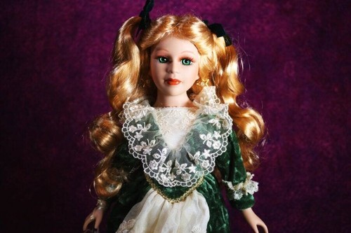 You will be receiving a beautiful porcelain doll. Trewena is around 14-16 inches tall. Her body is stuffed and her head, neck, arms, and legs are made of porcelain. She has very long blonde hair held in pigtails and charming green eyes. She is wearing a frilly green and white dress with flower patterns. She is also holding an umbrella.