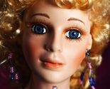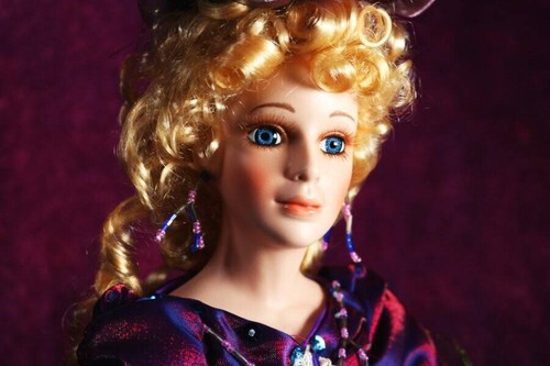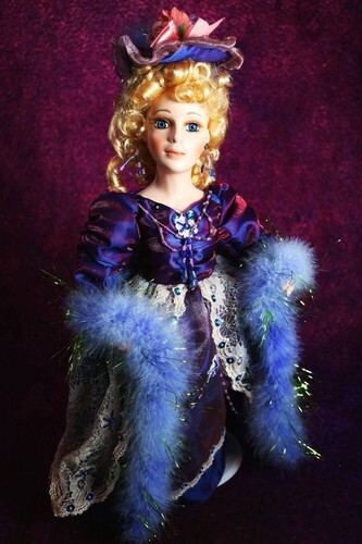 You will be receiving a beautiful porcelain doll. Zillitia is around 14-16 inches tall. Her body is stuffed and her head, neck, arms, and legs are made of porcelain. She has long, curly blonde hair topped with a headdress. She has the bluest eyes. And, she is wearing a violet and silver dress with beads. She is also holding a feather boa.