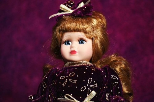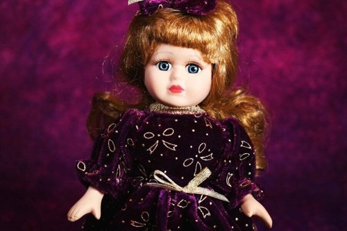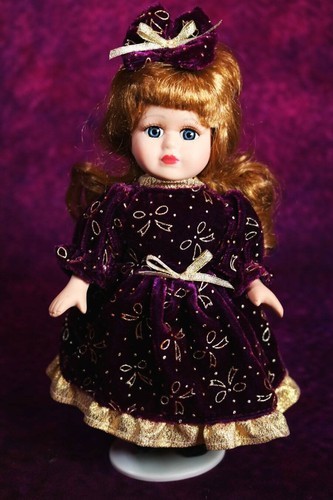 You will be receiving a beautiful porcelain doll. Zuasi is around 7-8 inches tall. Her body is stuffed with her head, neck, arms, and legs are made of porcelain. She has long, wavy blonde hair topped with a bow. She has lovely blue eyes. She is wearing a violet dress with golden ribbon accents.