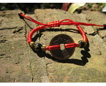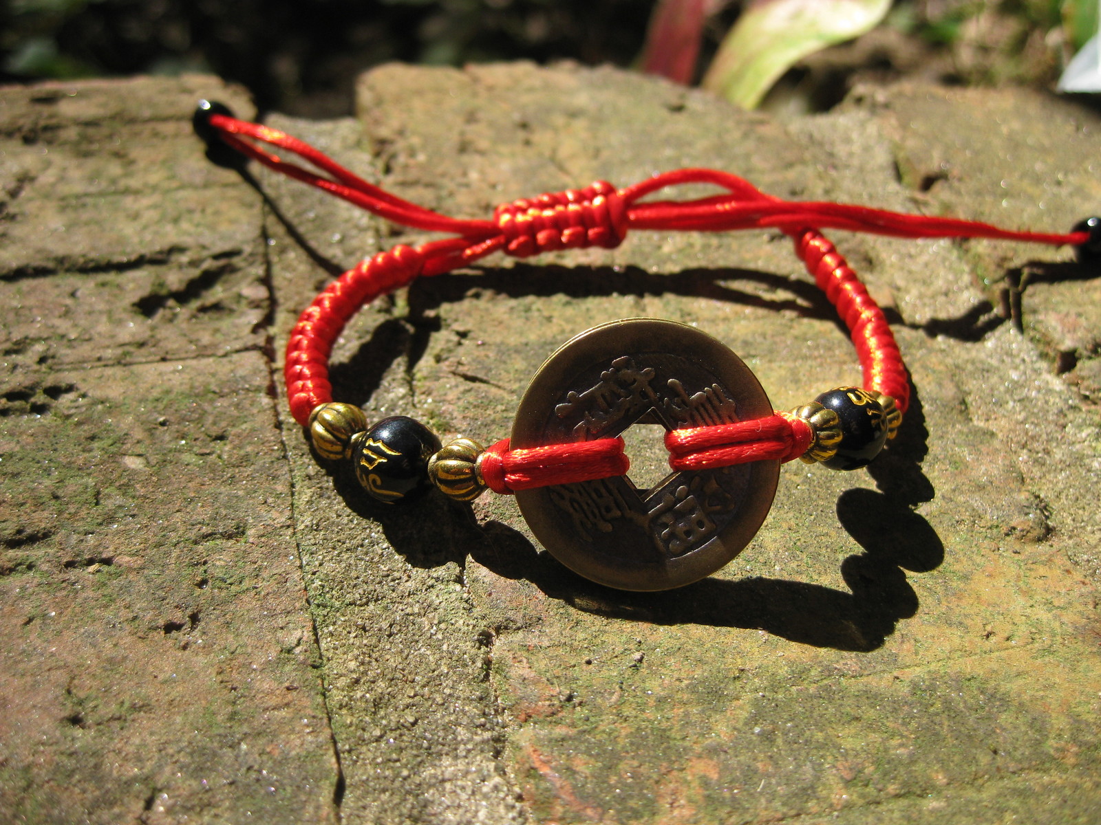 Bracelet: Adjustable braided red cord with 2 black beads with chinese symbols for luck and prosperity. There are 5 brass coins stacked up on the bracelet. Each with a different blessing.