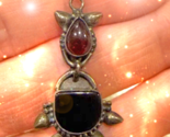 1 1/2" X 2" STERLING ONYX AND GARNET ANTIQUE AMULET WITH A 30" STERLING CHAIN