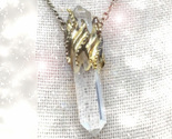 Suspended from a band of hammered gold leaves that shimmer like frozen sunlight, this pendant carries a clear quartz point, elongated and luminous, capped with traces of white fire that move faintly within. At a glance it is ethereal, almost fragile—but its simplicity conceals depth. Within its crystalline veins hums an ancient resonance, a harmonic older than suns: the living current of the Silver Flame Masters, whose art was Transcendent Integration — the merging of heaven and flesh, silence and power, form and spirit.