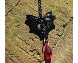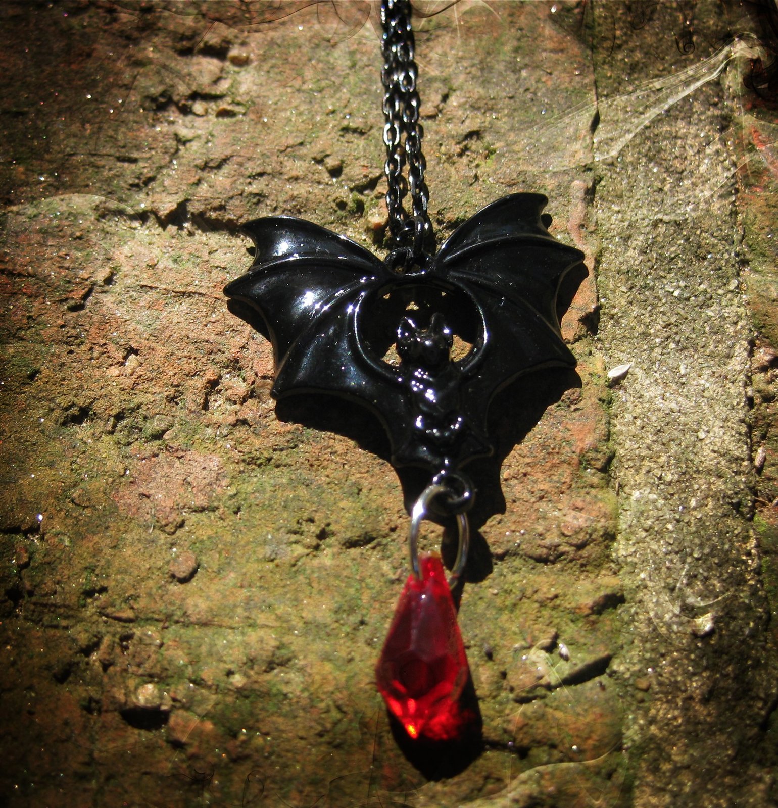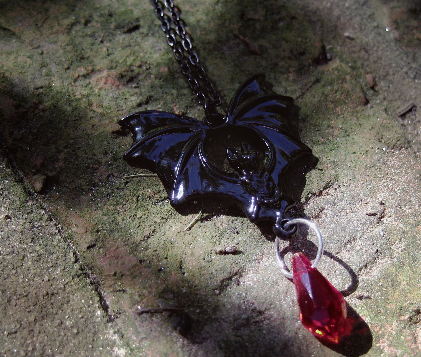 Vessel: An alluring Black bat with a dangling red crystal. This pendant comes on a black recharging chain.