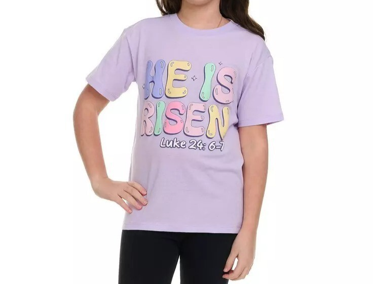 This graphic t-shirt features a purple base and promotes the phrase "He Is Risen" in colorful print.