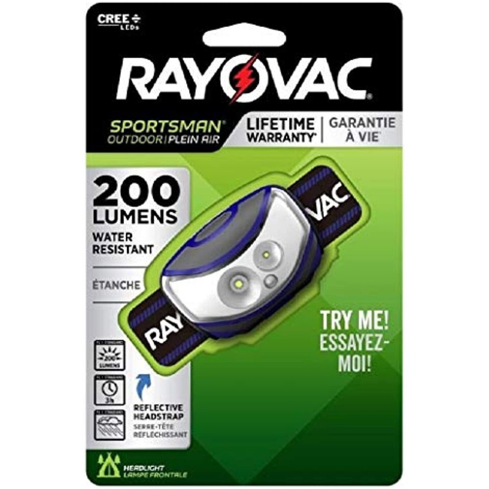 Go headfirst into your next adventure with the Rayovac sportsman headlight. The high performance Creeª LEDs deliver up to 200 lm, and let you switch from spot to flood modes without moving a lens. If you need a little less light, energy saver mode dims to 20 lm and helps prolong battery life up to 6 hours. The red LED helps you maintain night vision without drawing attention or distracting those around you. Plus, the 6 Ft. drop test performance and ANSI FL 1 water-resistant housing keep this headlight going in rugged conditions. Brightness: up to 200 Lumens (white LED mode); up to 20 Lumens (energy saver mode) Beam distance: up to 45 meters (white LED mode); up to 15 meters (energy saver mode) Battery run time: up to 3 hours (white LED mode); up to 6 hours (energy saver mode) Pivoting head to adjust the angle of illumination Requires 3 AAA Rayovac batteries (included) Go-anywhere durability: 6 Ft. drop tested, ANSI FL 1 water resistant, and protected by our lifetime warranty CA Residents: Prop 65 WARNING(S)