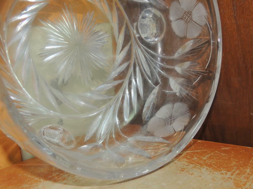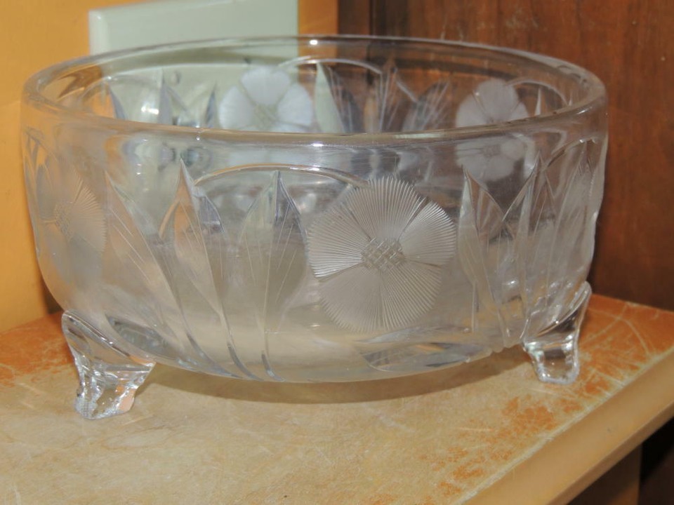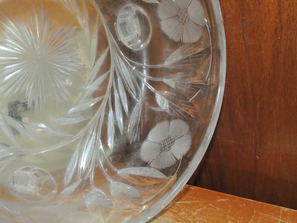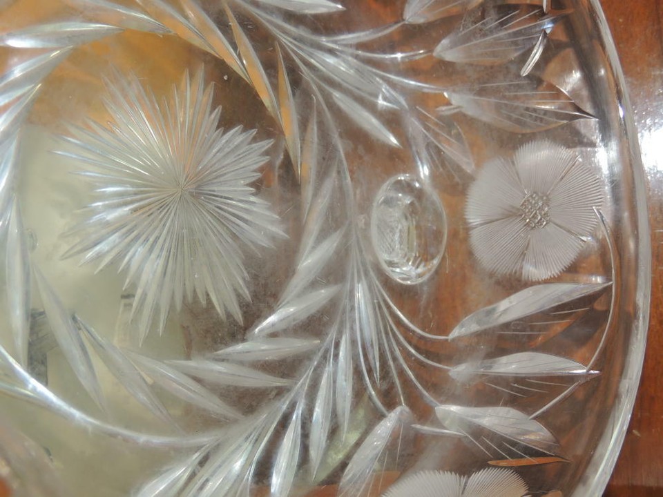 - Heavy Cut Glass Crystal Bowl 7.5" footed floral star starburst antique vintage