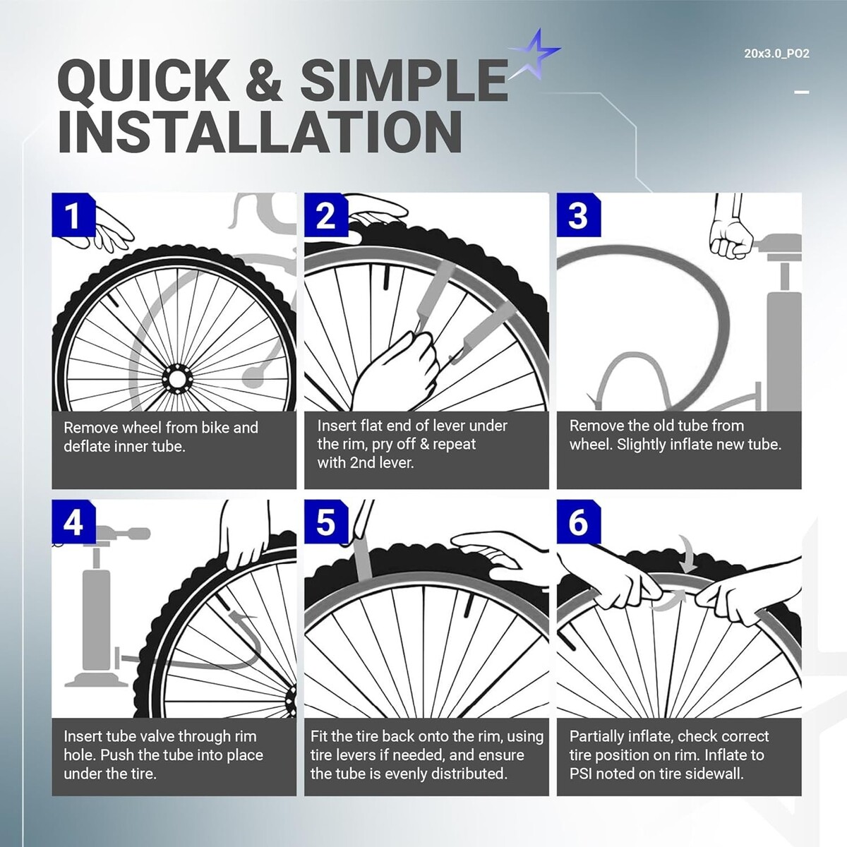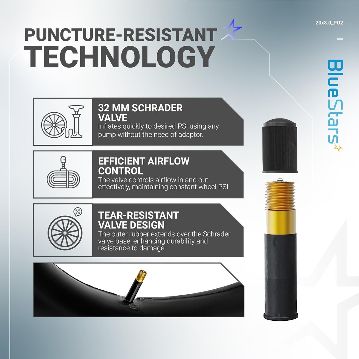 Specifically designed to fit 20-inch tires with a 3.0-inch width, BlueStars Schrader Valve Inner Tube is ideal for mountain bikes, gravel bikes, city bikes, and electric bikes, providing a seamless fit and reliable functionality for a smooth, uninterrupted ride.