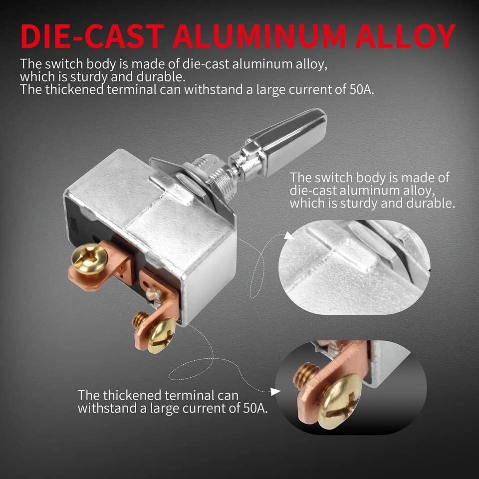 Feature: Automotive toggle switch is made of metal .The handle is chrome plated.Delicate appearance with strong Construction.The rating is 50A 12VDC.