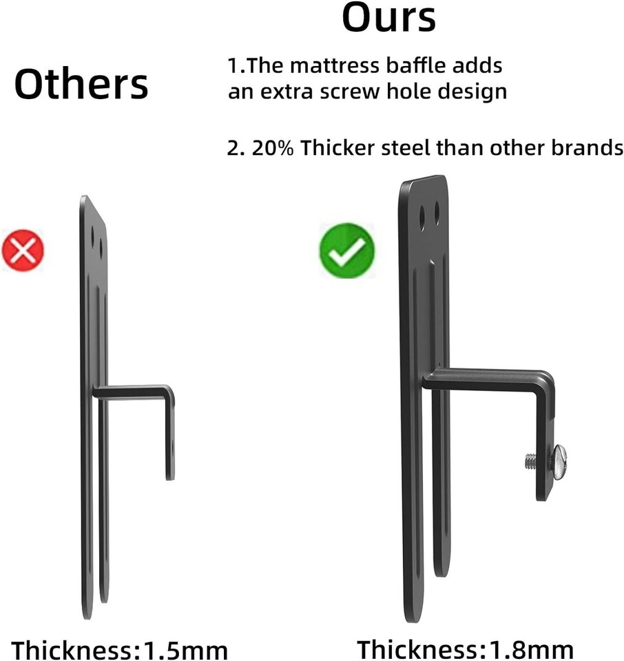 Measurement Precision: The total height of our mattress stoppers is about 3.5 inches, with an upper section height of 1.42 inches, suitable for most mattress thicknesses. Designed for bed frames with a thickness of less than 0.98 inches (2.5 cm).