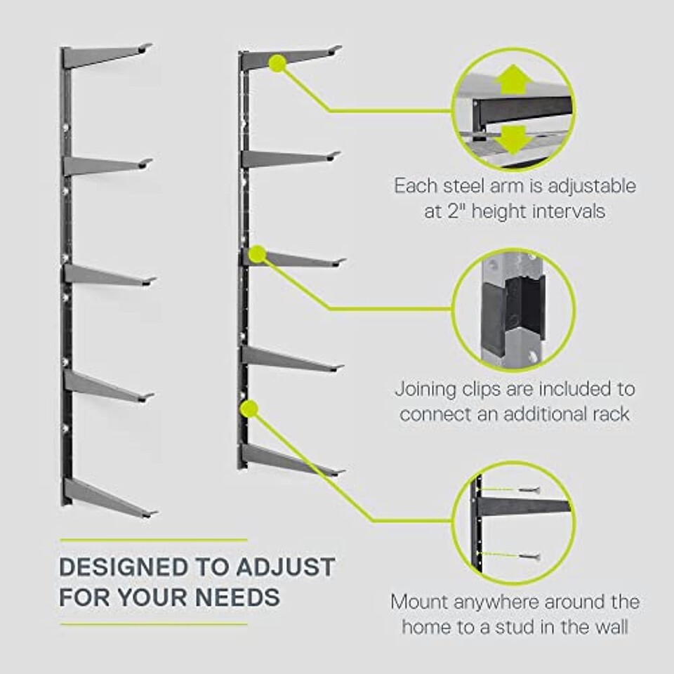 Designed To Adjust For Your Needs: Each steel arm is adjustable at 2" height intervals. Joining clips are included to connect an additional rack. Mount anywhere around the home to a stud in the wall.