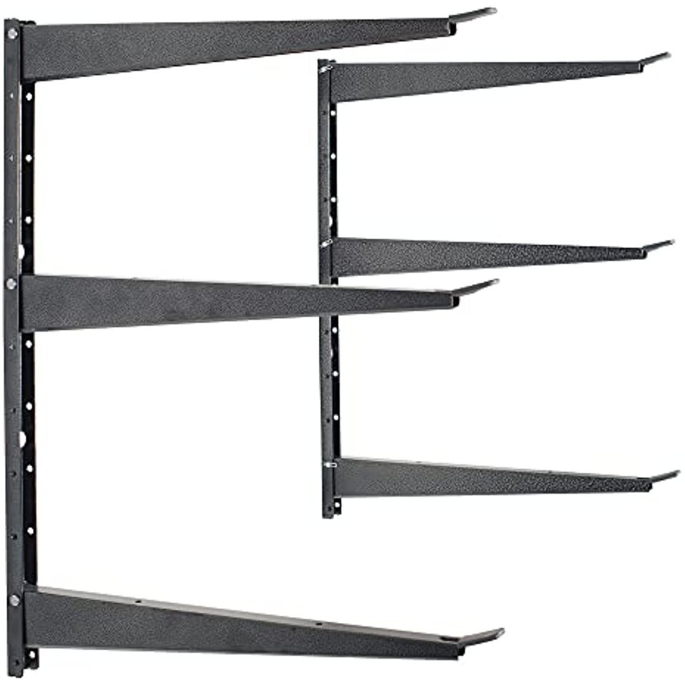 Securely Store Heavy Gear Without Sacrificing Floor SpaceNothing beats the satisfaction of a successful DIY. But when your projects require large tools and materials like lumber, your garage or workshop quickly becomes overcrowded. Not only does this make organization impossible, it?s also difficult to work efficiently.Delta?s Heavy-Duty Wall Rack allows you to store big, bulky equipment up and out of the way. Featuring 3 sets of storage arms, it securely holds lumber, tools, ladders and off-season equipment. Each tier safely accommodates up to 160lbs, boasting a total 480lb capacity. Simple yet effective, it takes the guesswork out of creating an industrial strength storage system in your own home.The arms can be positioned in 2 height intervals, effortlessly maximizing storage capacity. And since they have locking pins, they remain securely in place if bumped. With the addition of shelves or hooks, you?ll have a designated area for paint cans, extension cords and more. Each order comes with joining clips, allowing you to combine racks vertically. Order also includes heavy-duty lag bolts for secure, quick and easy installation.Strength this robust relies on premium steel construction. Famously durable, you can rest assured your gear is in good hands. Finished in a hammered powdercoat, it?s a handsome addition to your garage, basement or shed.Why Choose Our Heavy-Duty Wall Rack?- Increases storage space in the garage, shed or basement- Securely holds up to 480lbs- Joining clips allow you to combine racks vertically- Easy to install with the included hardware- Premium steel construction with powdercoat finish