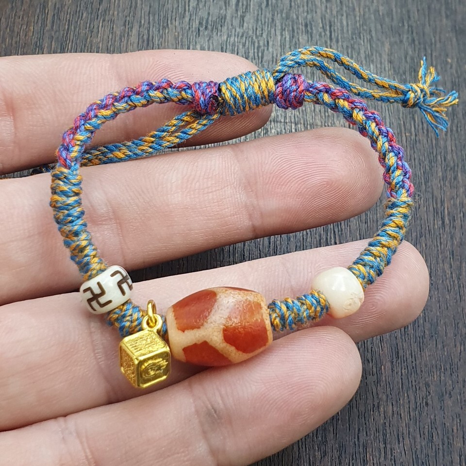 La pulsera de cuentas Dzi hecha a mano cuenta con cordon multicolor y cuentas espirituales, originarias del Tíbet. Hecho a mano con agata como material principal, este brazalete original vintage refleja una rica historia y significado cultural. Hecho con cuidado y atencion al detalle, esta pulsera es una pieza única y hermosa que encarna la artesanía tradicional tibetana.