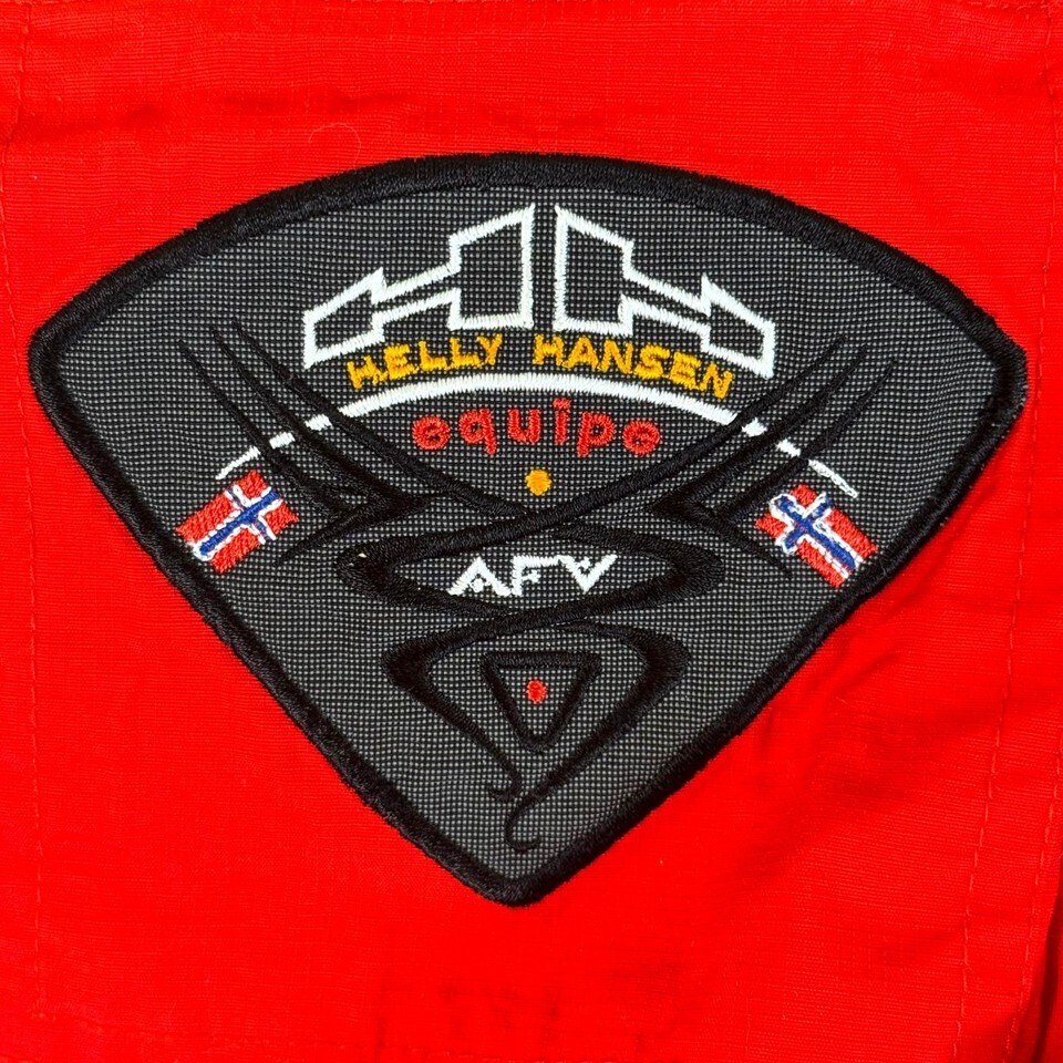 Vintage Helly Hansen Equipe AFV performance ski suit in red and black. Features Helly Tech waterproof breathable construction with Schoeller Keprotec abrasion panels at shoulders, elbows, and knees. Built for alpine and patrol use ? tough, flexible, and weatherproof with classic '90s styling.