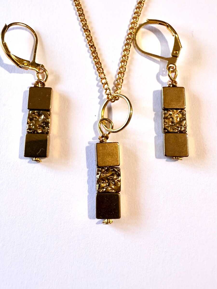 Beautiful Victorian gold tone Hematite square shape jewelry set earrings and necklace. Hematite duplicitous earrings and necklace . The hematite beads are from the one side hammered rough style and on the other side are smooth sanded . Dangle earrings. Drop earrings . Boho jewelry set earrings and necklace. Bohemian jewelry set earrings and necklace. Vintage style set earrings and necklace. Victorian beautiful earrings and necklace . Antique style jewelry set earrings and necklace.