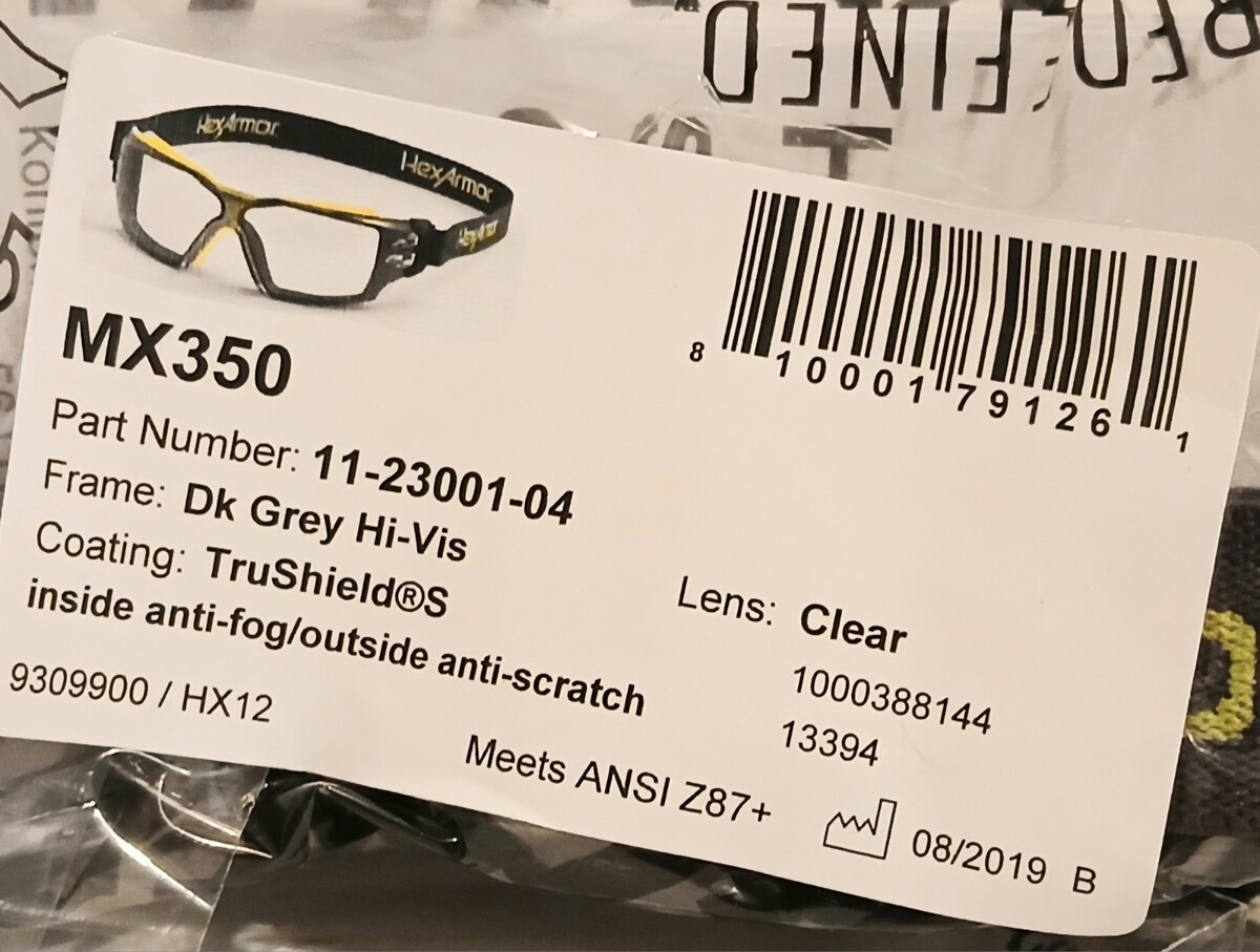 This is a New Factory Sealed Hex Armor Safety Glasses. These glasses are Anti Fog Anti Scratch as shown in the second photo. Thankyou for looking