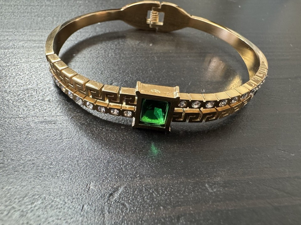 - High Polish Gold And Green Gem Stone Bracelet Bangle Open Cuff As In Pictures