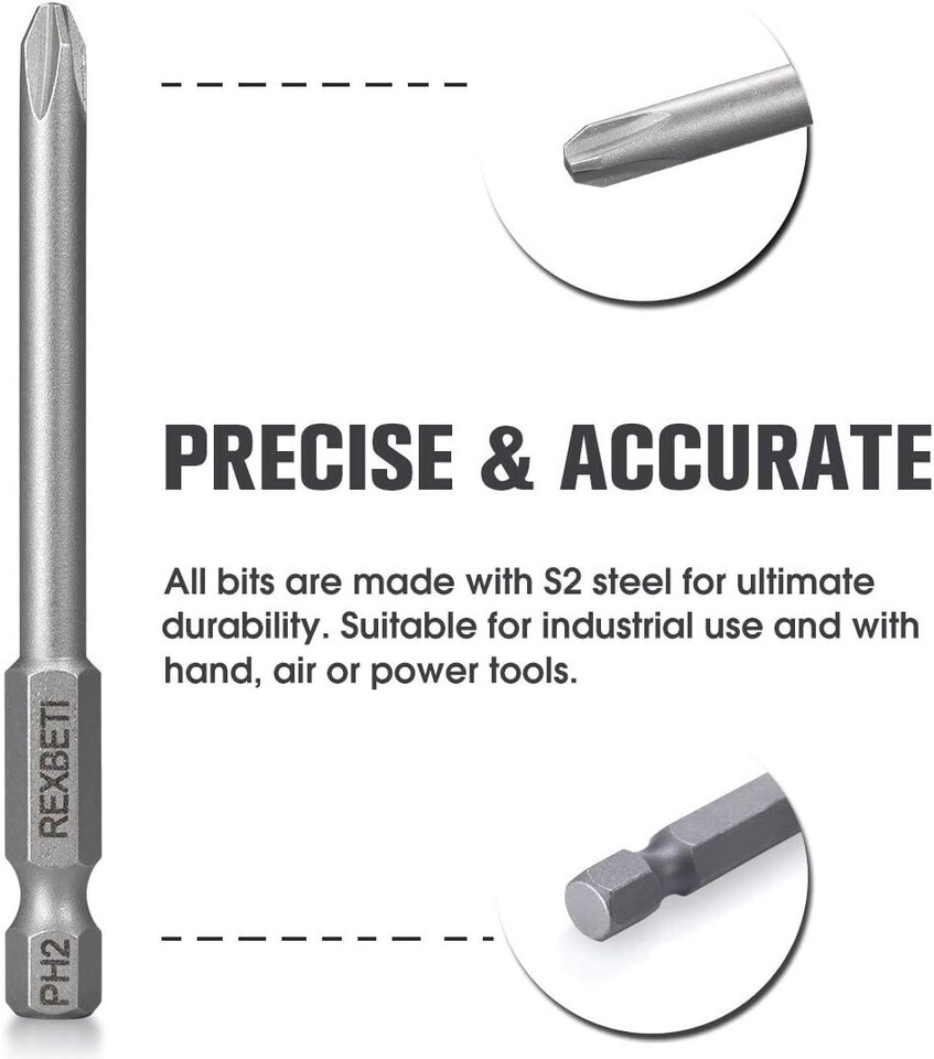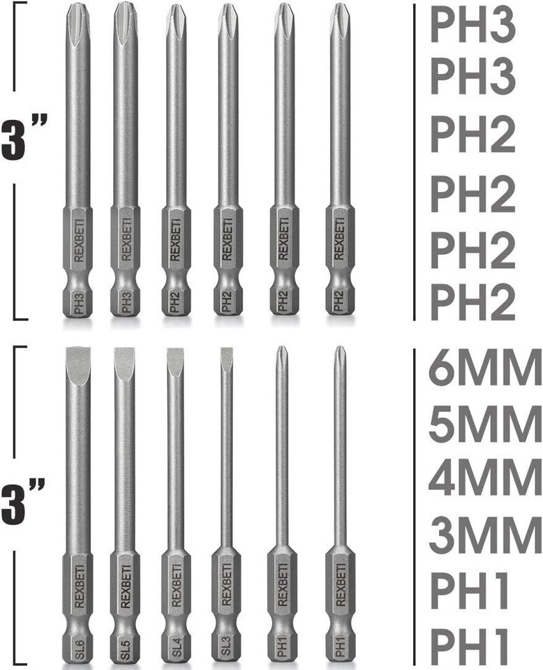 Sizes Included: 2 pcs of PH1, 4 pcs of PH2, 2 pcs of PH3, along with 3mm, 4mm, 5mm, and 6mm slotted bits.