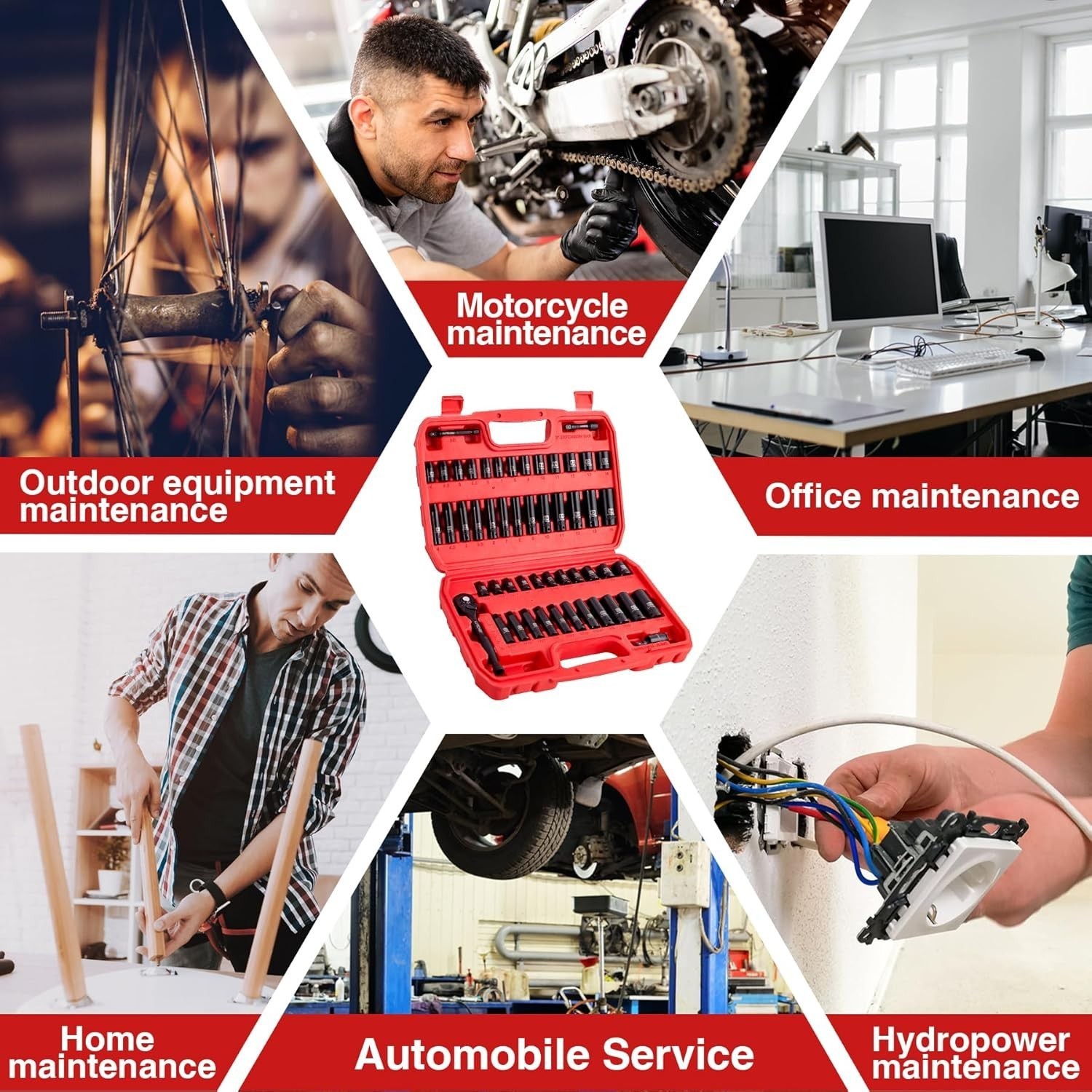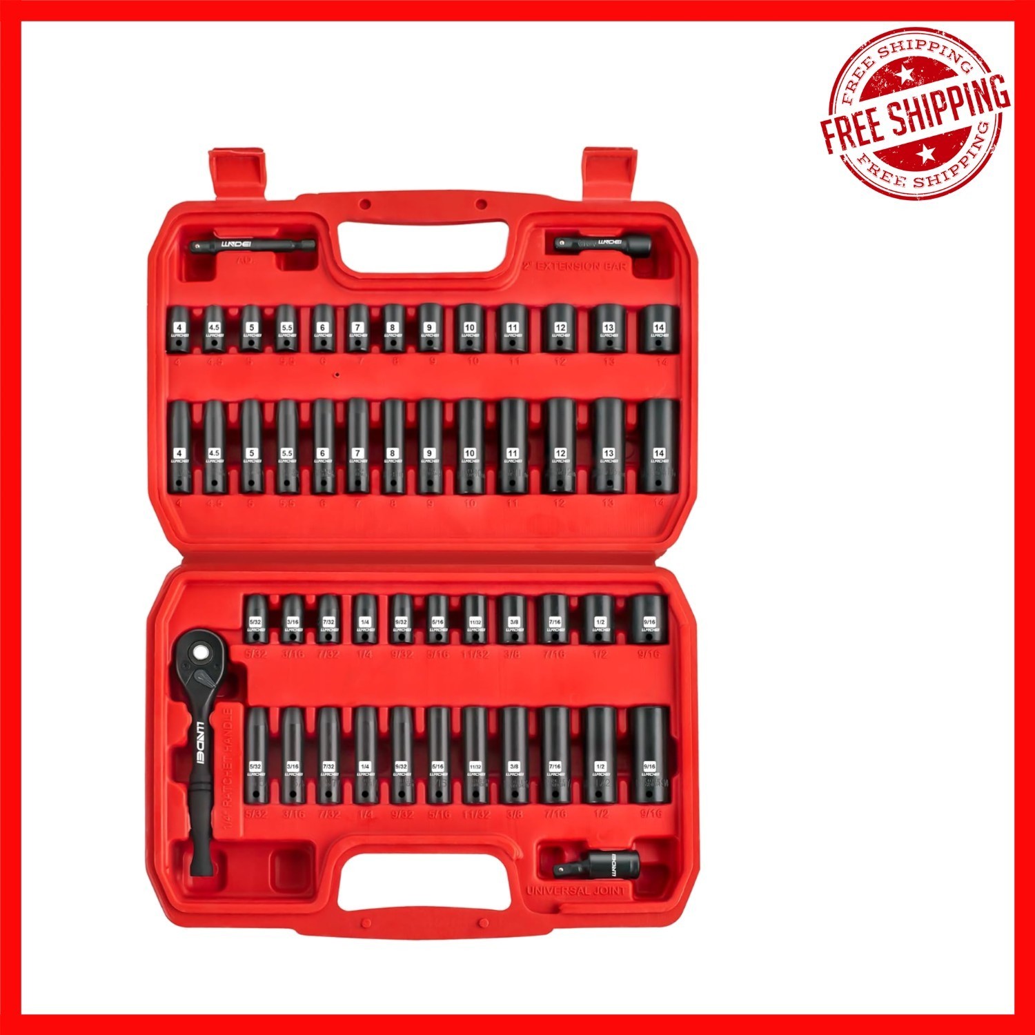 Discover the LLNDEI Socket Set, crafted from durable chrome vanadium steel (50BV30), engineered to withstand extreme torque for demanding tasks. Its 6-point design ensures a secure grip on fasteners, preventing round-off during high-stress applications. Organized in a heavy-duty blow-molded case with size labels, it offers easy transport and safe storage. This comprehensive set includes 48 SAE and metric sockets, a ratchet handle, impact extension, universal joint, and adapters?perfect for home repairs and professional use. Backed by a lifetime and compliant with ANSI and DIN standards, it's an ideal gift for DIY enthusiasts and professionals alike.