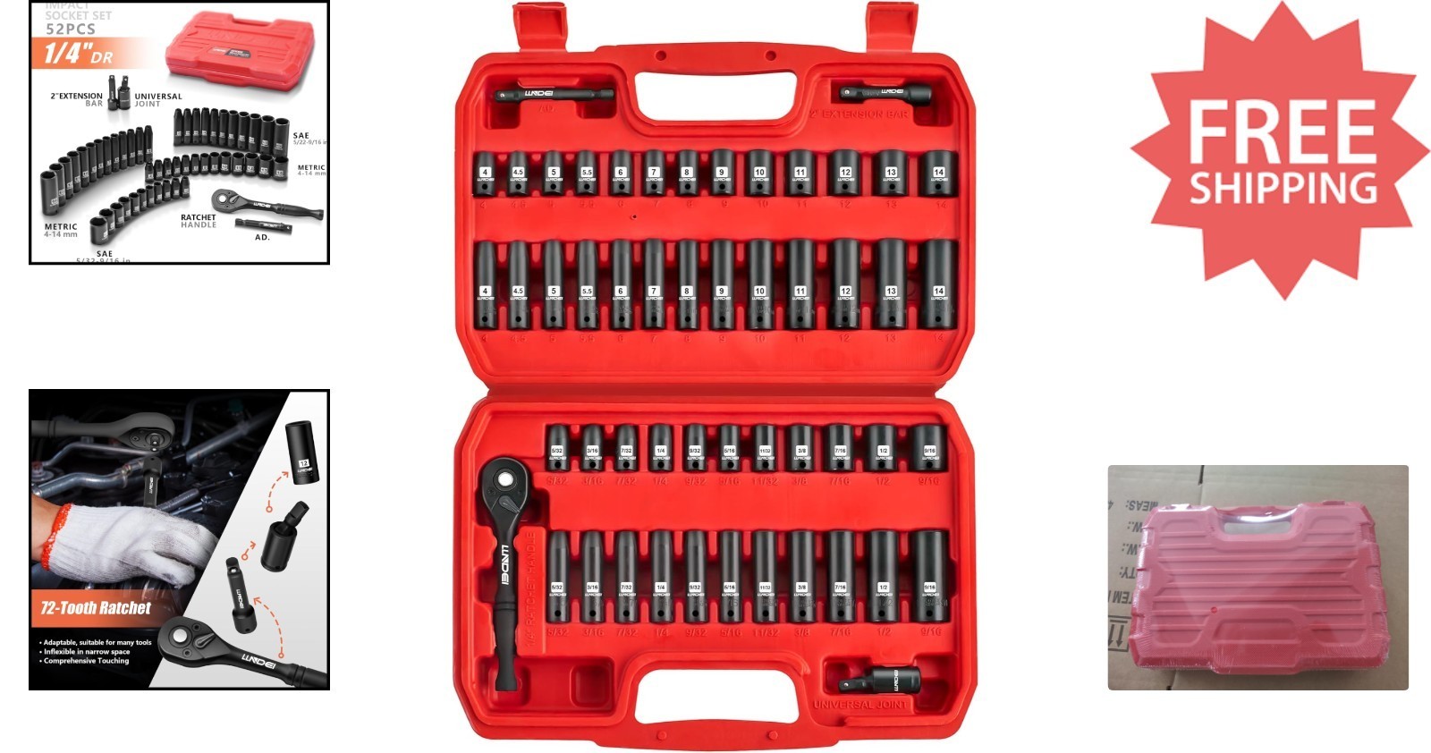 Tools Included: Adapter,Sockets,72-Tooth Ratchet,Universal Joint,Impact Extension Bar