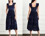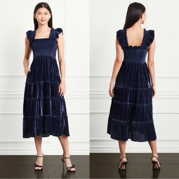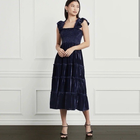 Hill House Home Ellie Nap Dress in Navy Velvet Size XS - 75 rayon 25 nylon - The Nap Dress is soft, comfortable, and pretty enough to wear all day and night. The Ellie is an A-line Nap Dress with elasticated smocking, ruffled shoulders, tiered midi skirt, and pockets.