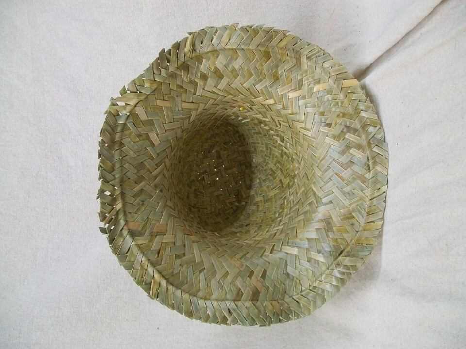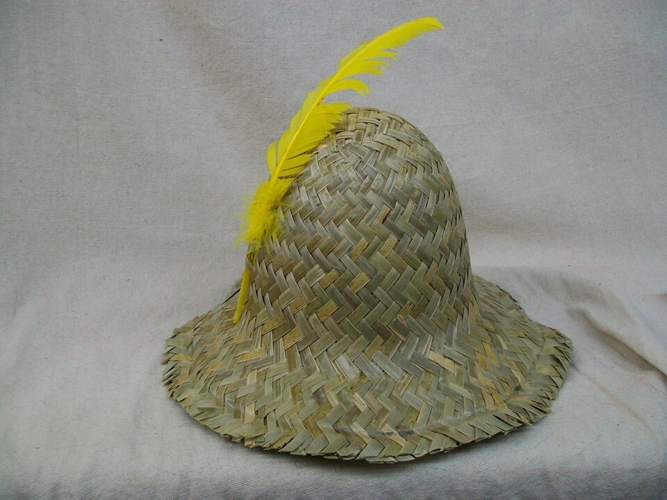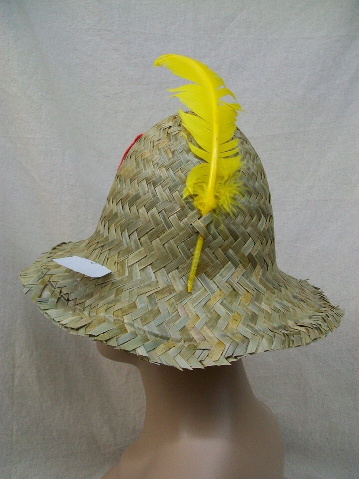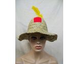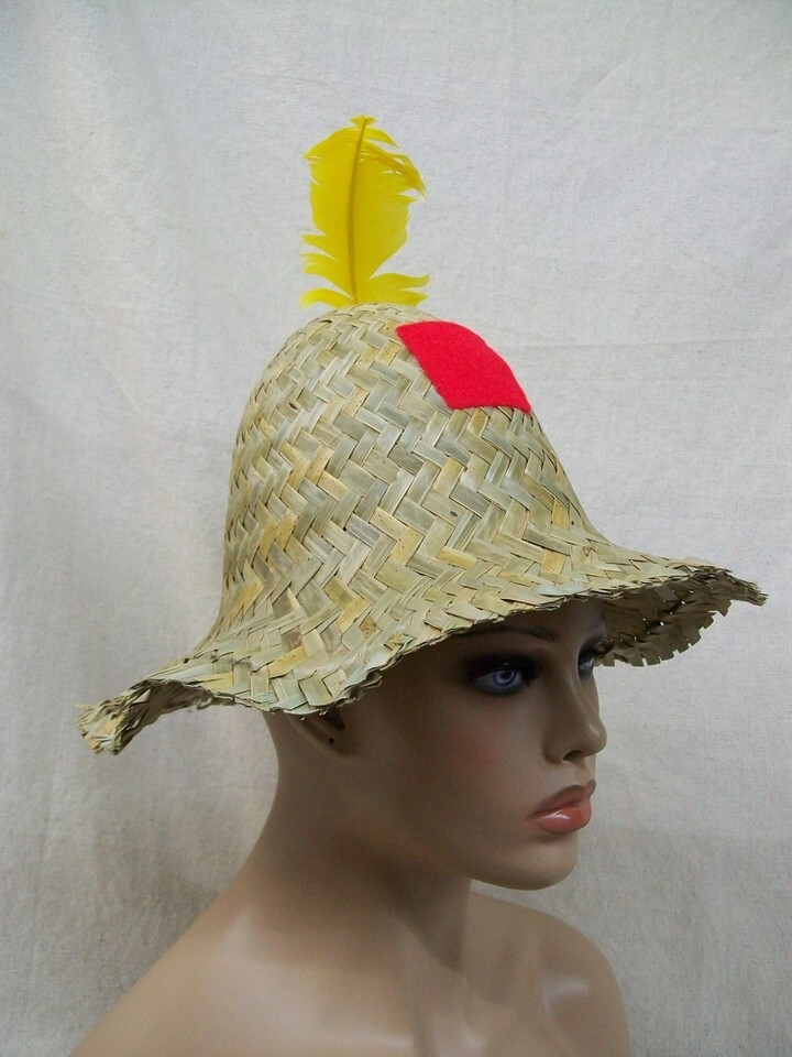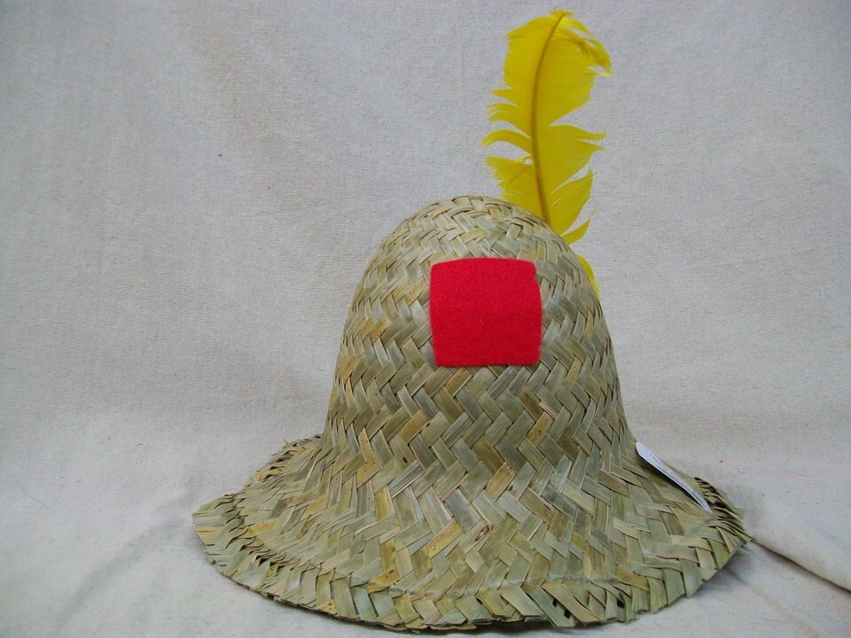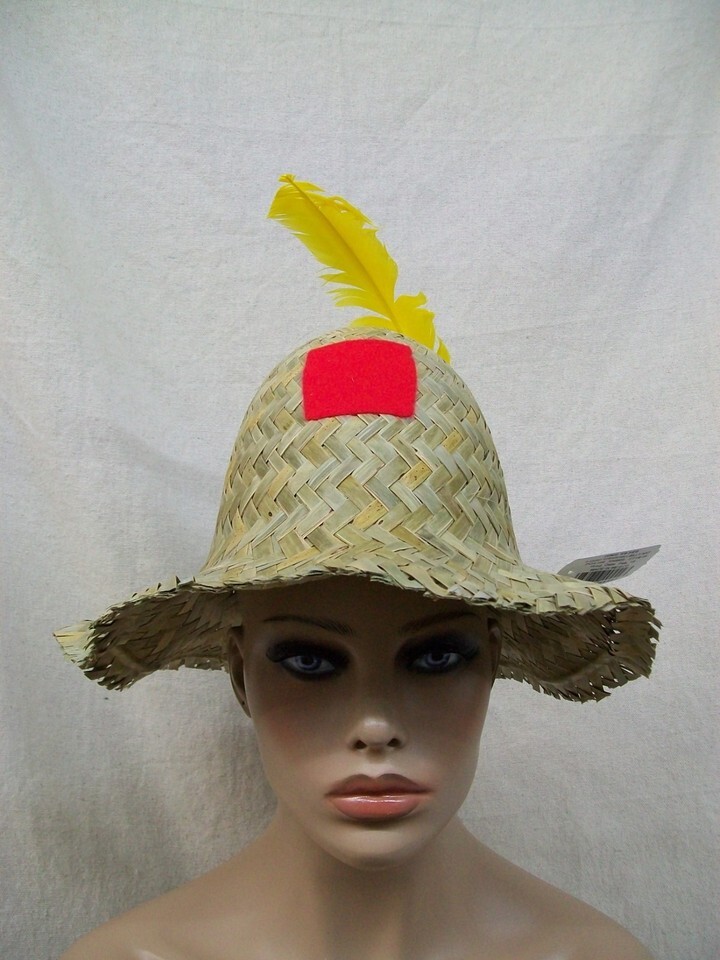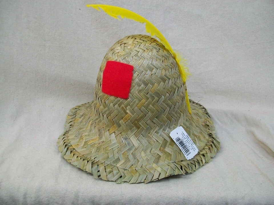 Straw costume hat. Has a red piece of felt and yellow feather to tuck in the hat. Straw will shed. The edges are wavy and frayed. No age specs but most costume items are for ages 14 and up. I'll have to take the feather out for shipping purposes. Patches may be in