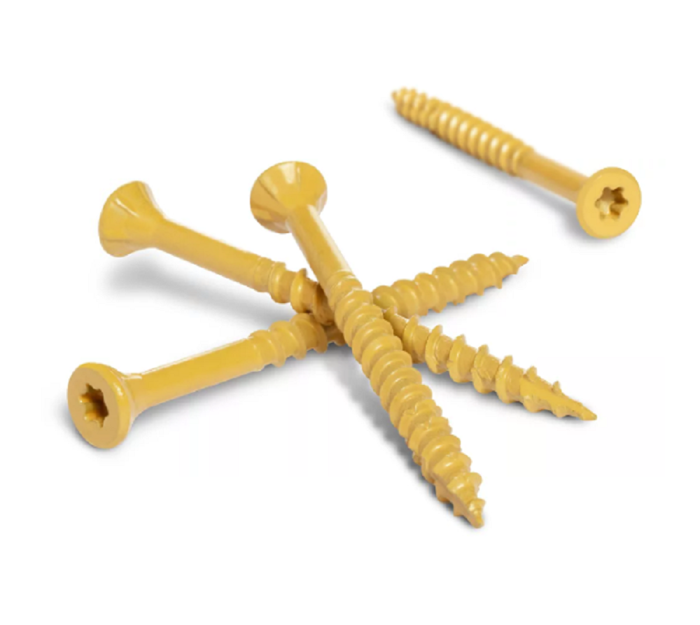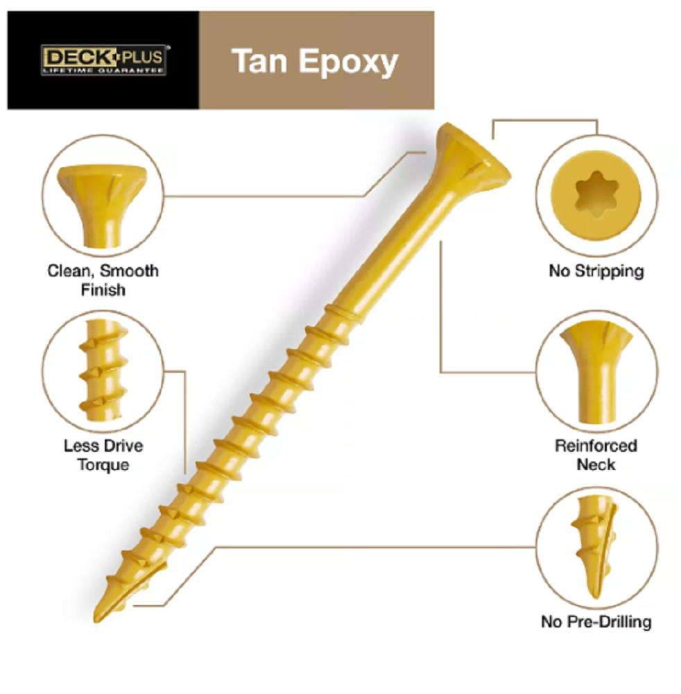 SELF-DRILLING POINT: Together, coarse Screw (threads and a self-drilling point design eliminate the need for a pilot hole FLAT-HEAD STYLE: Sits flush with material TAN EPOXY COATING: 4-layer coating provides superior rust and corrosion protection STAR DRIVE STYLE: Also known as Torx, this drive is designed to reduce slippage and camout when tightening the screw FREE T25 STAR BIT: Free driver bit included in package to match screws and take the guesswork out of installation SAFE FOR TREATED LUMBER: Recommended for use with ACQ, CA, and CCA treated lumber LIMITED LIFETIME WARRANTY: Parts carry a limited lifetime warranty against rust corrosion