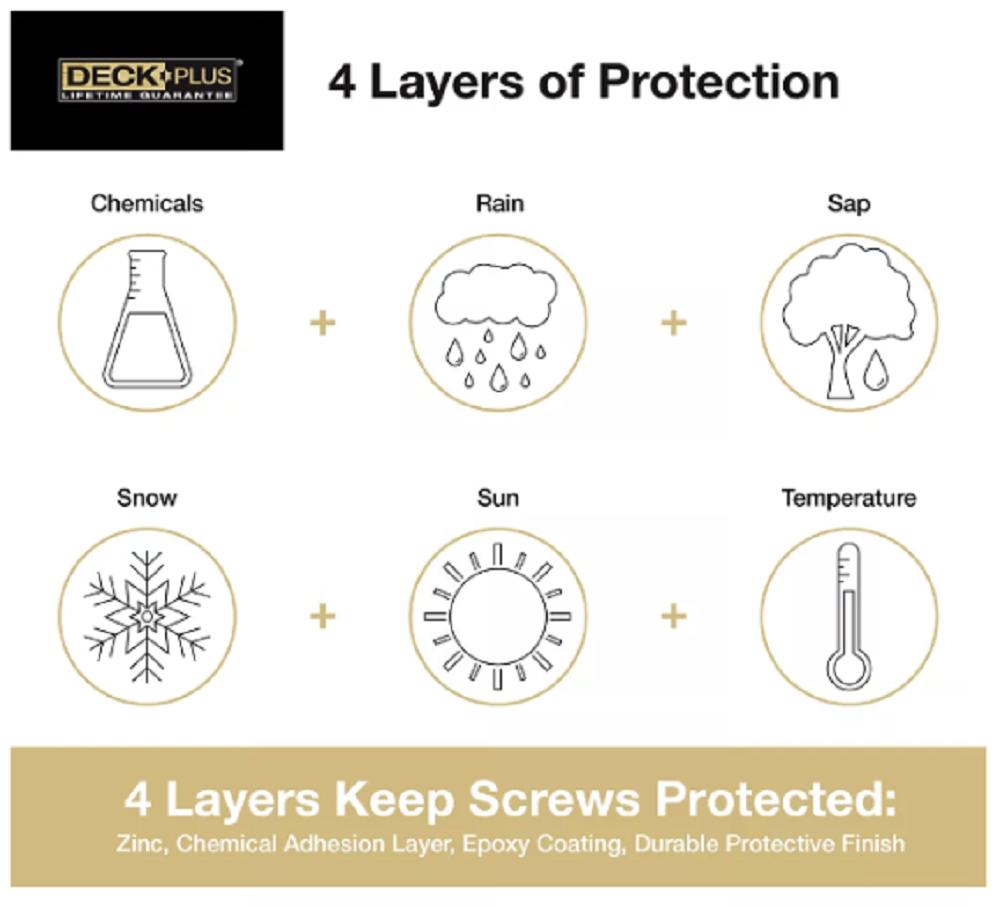 Deck Plus Deck Screws offer a comprehensive finishing fastener solution, including exterior wood, composite, and trim uses. Deck Plus requires no pre-drilling and is perfect for all of your decking, fencing and exterior wood project needs.