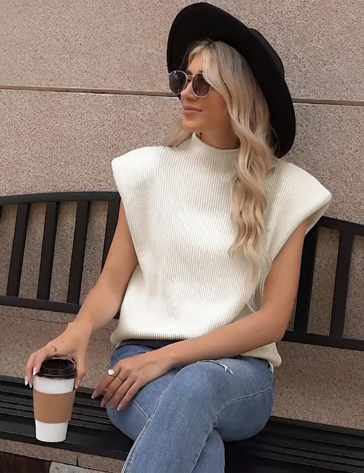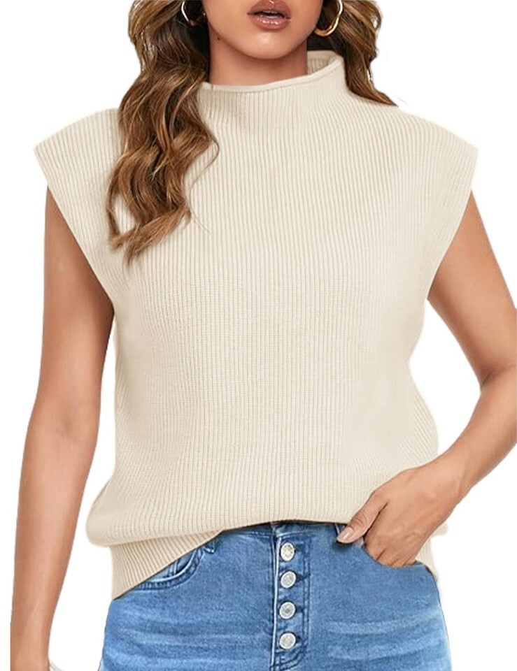 Knit from viscose yarn, this mock neck short sleeve sweater vest has cool extended shoulders, sleeveless knit sweater vest with turtlenecks
