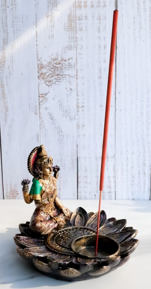? The Lakshmi sculpture holds a votive candle and is perfect for your altar decoration as well as a home fragrance accessory..