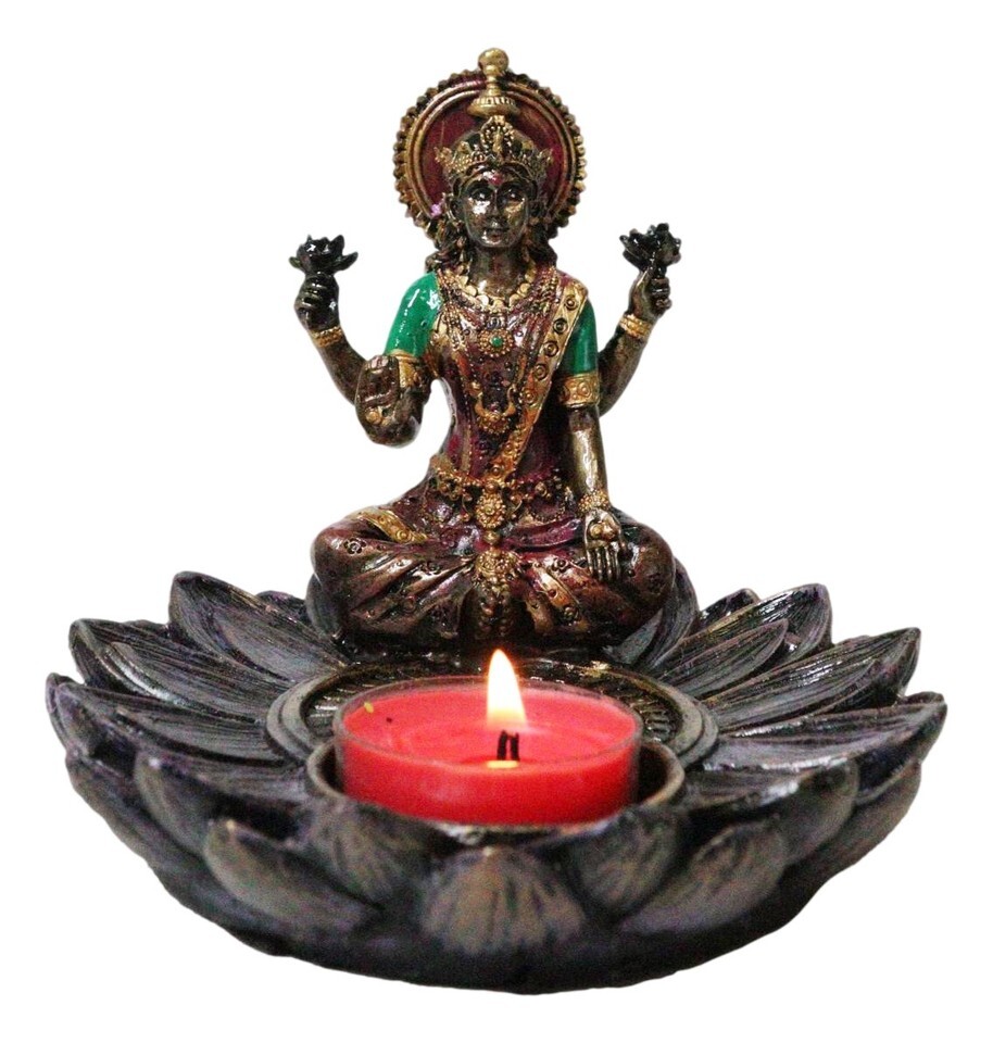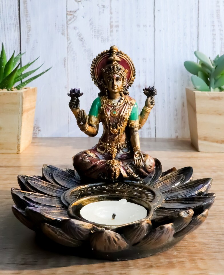 - Hindu Goddess Sri Lakshmi On Lotus Padma Flower Votive Candle Holder Figurine