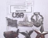 Silver tone charms for Charmed America/USA. Includes: USA, American Flag, Washington DC capital building, Statue of Liberty, Map of USA, Bald eagle and star. New.