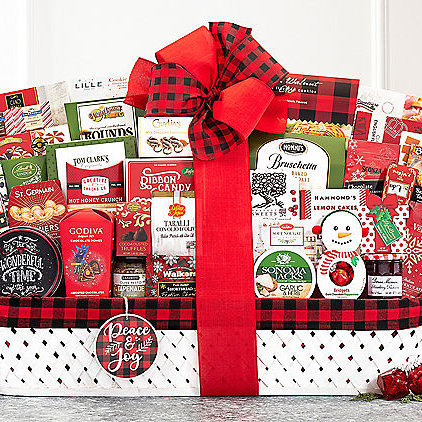 This grand holiday gift basket is filled with more than three dozen different gourmet treats so everyone can find something to enjoy. French milk chocolate crepes, dark chocolate peppermint truffles, poppy seed crackers, garlic herb cheese wedges, cranberry sesame cookies, candy cane almonds, lemon cakes, marinated basil and thyme artichoke snacks, Ghirardelli peppermint bark, strawberry preserves, vanilla fudge, fruit jelly candy and too much more to list make this massive holiday gift basket perfect for sharing.