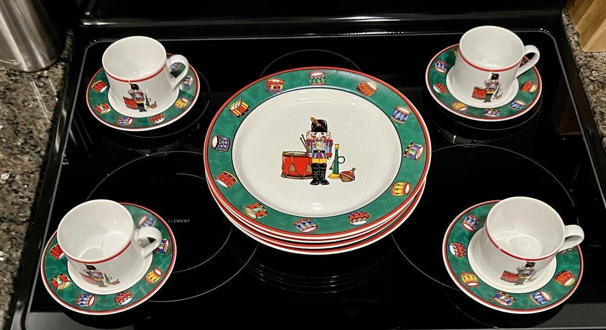 This lot includes 4 dinner plates, 4 cups, and 4 saucers.