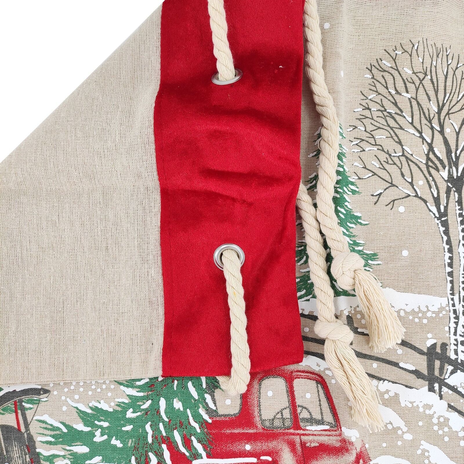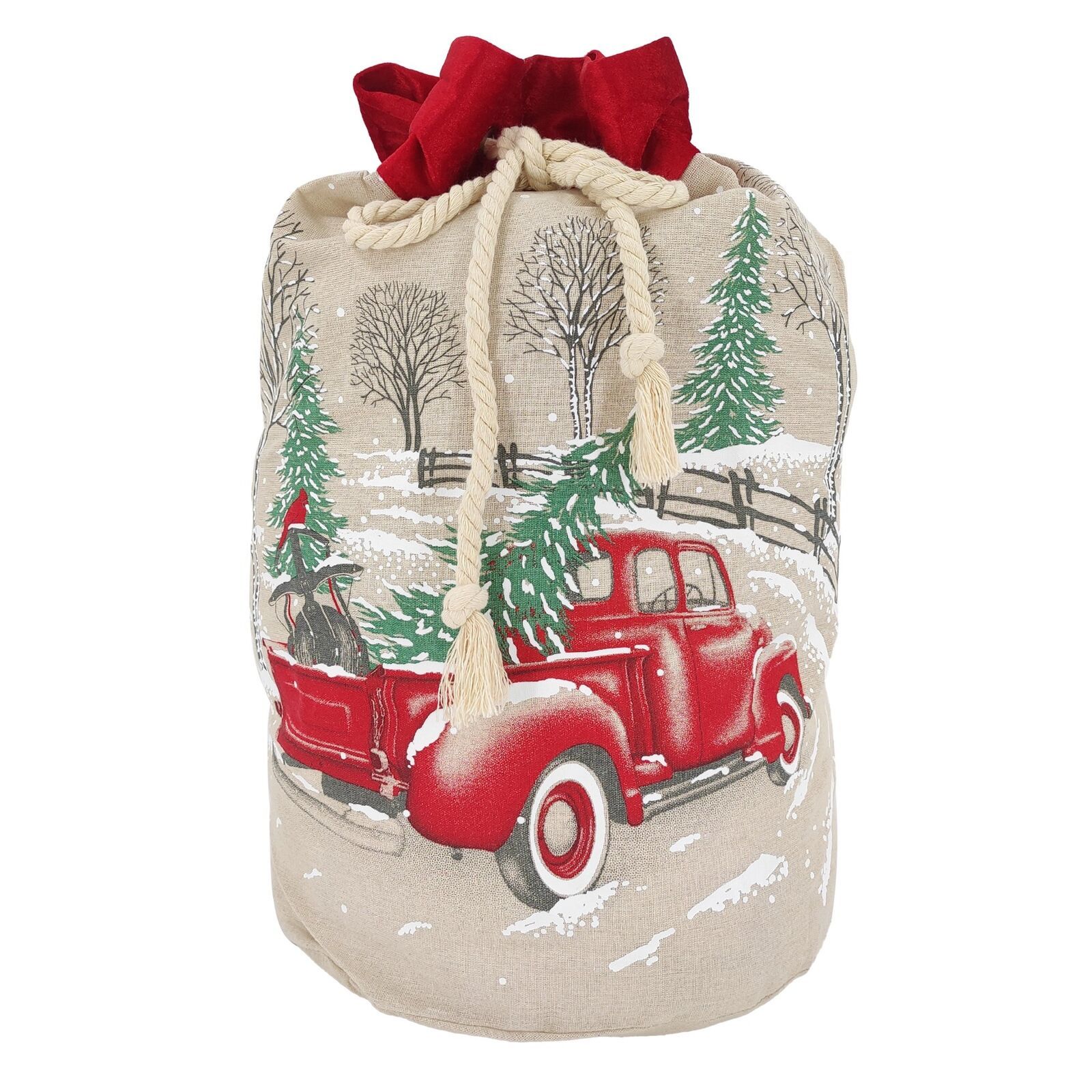 Natural ivory Burlap gift bag print with Red Truck With Christmas Tree and Snow and a coordinating drawstring cord closure. A drawstring closure keeps contents secure and hidden.