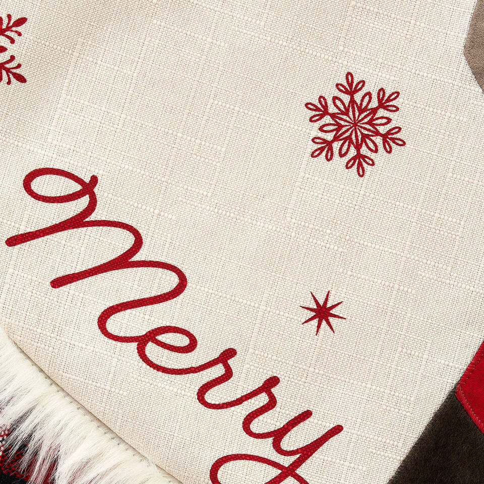 Features geometric deer applique, faux fur plaid border, and printed red snowflakes and "Merry Christmas" greeting