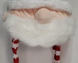 Festive dangle hat featuring the familiar holiday gnome character on top and red and white striped ear flaps with sweet pom poms on the end for a stylish look