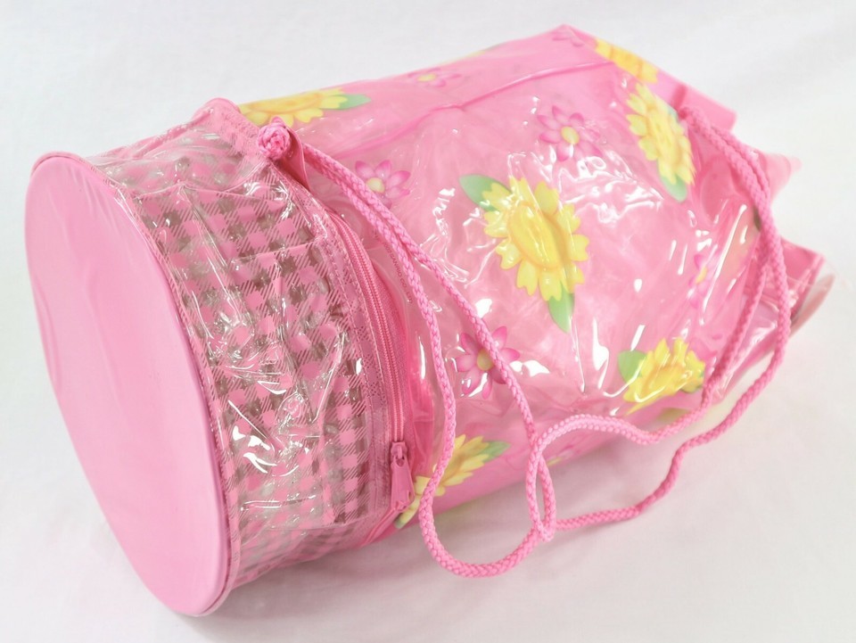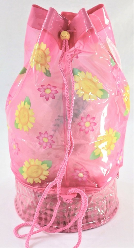 This adorable backpack features a floral pattern and is designed with a drawstring closure. It measures 16 inches in height, 8 inches in depth, and 16 x 8 1/2 x 8 1/4 inches in size. The backpack is made of vinyl material and has a pink color with a vinyl lining.