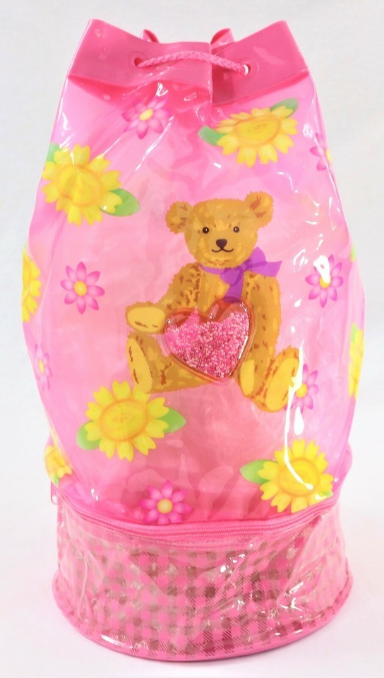 This adorable backpack features a floral pattern and is designed with a drawstring closure. It measures 16 inches in height, 8 inches in depth, and 16 x 8 1/2 x 8 1/4 inches in size. The backpack is made of vinyl material and has a pink color with a vinyl lining.