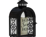 Here is a new lantern with led candle included, reads "Home Sweet Home." on the door, Exquisite arch shaped black metal lantern features lacy open filigree sides, along with large glass window in back and on the front door. Nicely detailed chimney accent, topped with round carrying handle, is the finishing touch. Glass on door displays an uplifting sentiment, while vintage curved latch holds door securely closed. Lantern is illuminated from within by the soft flickering of a ivory color pillar style LED candle, included. The candle sits inside lantern and is removable,This elegant vintage decor accent blends well with a variety of settings. Size of lantern is 11" high; 5.5" wide x 4.5" deep. Candle uses 3 AAA batteries, Batteries not included. , Nice lantern