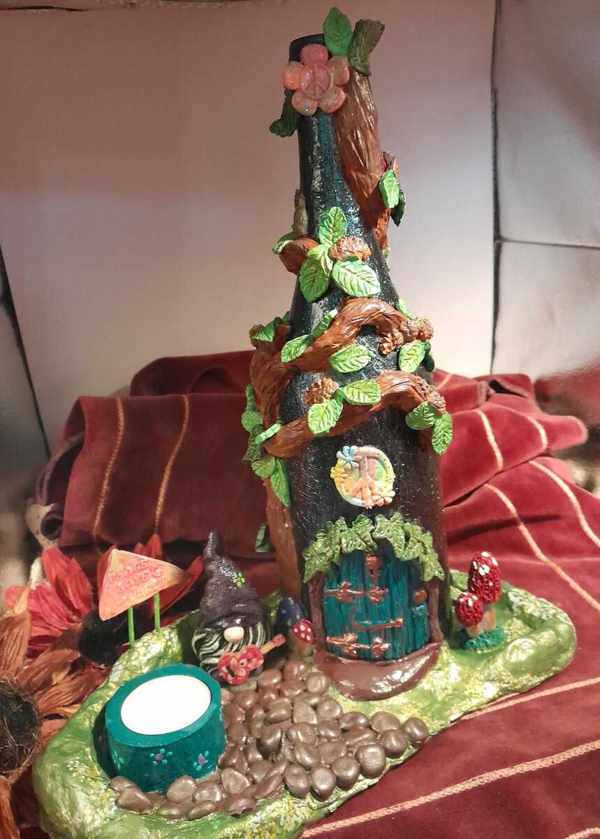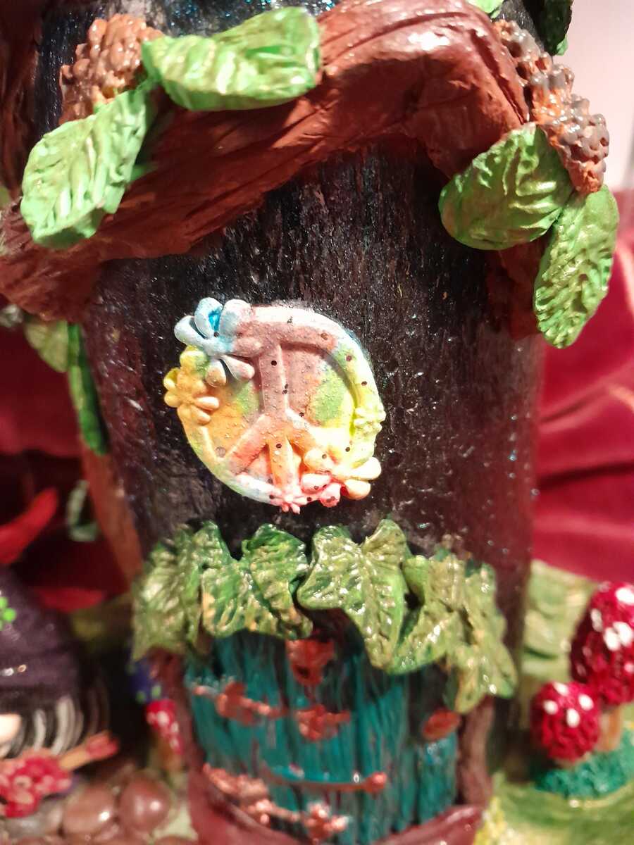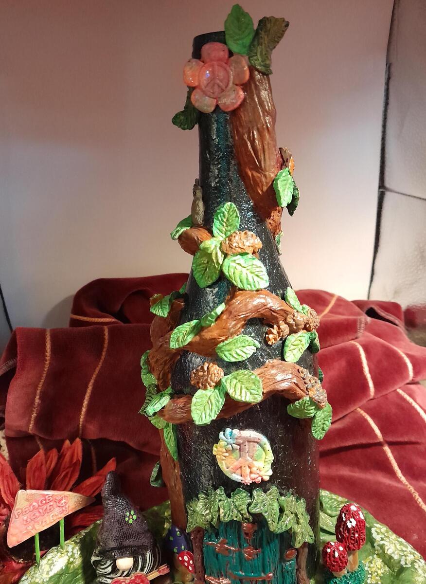 This is made from a small wine bottle, clay, foil, paint, resin, and lots and lots of Hippie Vibes Joy!