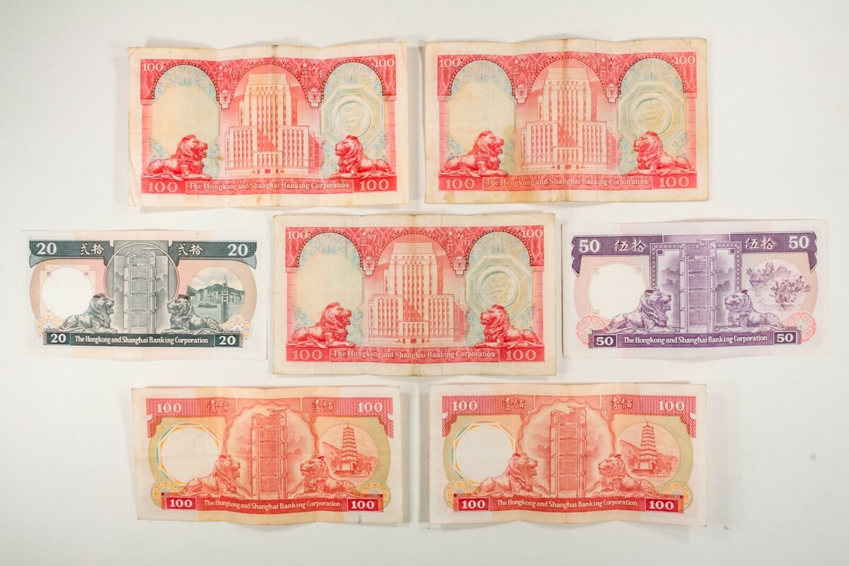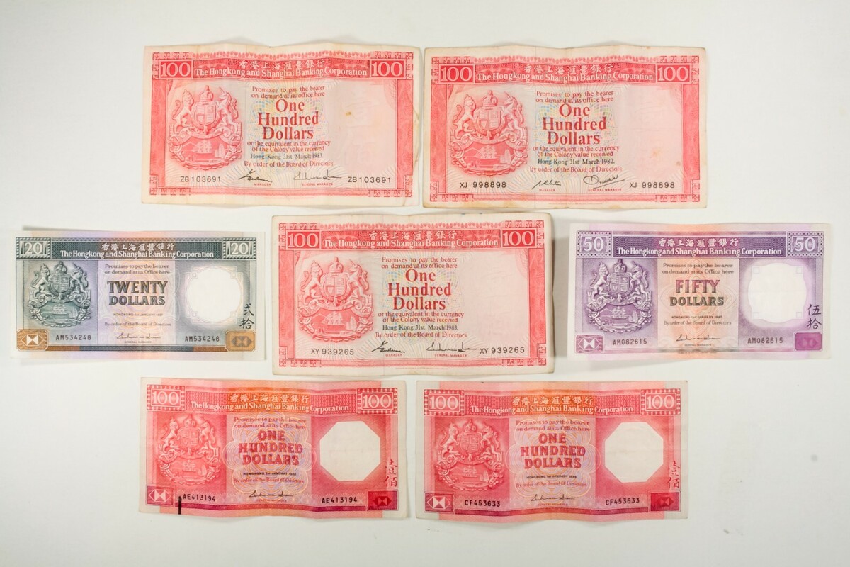 Hong Kong notes, 7 note lot. The Hong Kong Shanghai Banking Corporation.