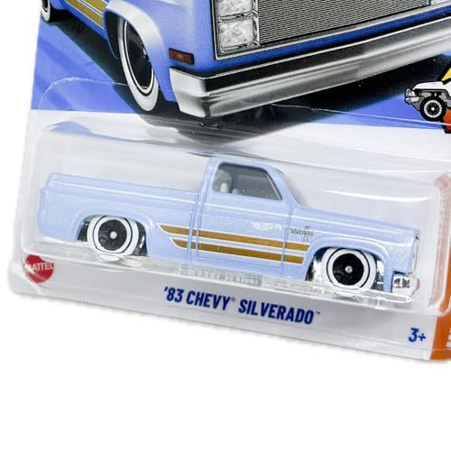 Product description: Rev up your collection with this stunning 1:64 scale Hot Wheels '83 Chevy Silverado in captivating blue! Part of the Hot Trucks series (9/10) and numbered 157/250, this die-cast metal vehicle captures the classic charm of the iconic pickup truck. The detailed craftsmanship showcases the rugged beauty of the Silverado, perfect for both play and display. Featuring die-cast construction and manual operation, this collectible vehicle measures approximately 3 x 5 x 7 inches in its packaging. Suitable for ages 3 and up, it's an excellent addition for collectors and truck enthusiasts alike. The manual operation ensures endless hours of imaginative play, while the quality die-cast metal construction provides durability and authentic feel. Whether you're adding to your Hot Wheels collection or starting a new one, this '83 Chevy Silverado is sure to make a statement.