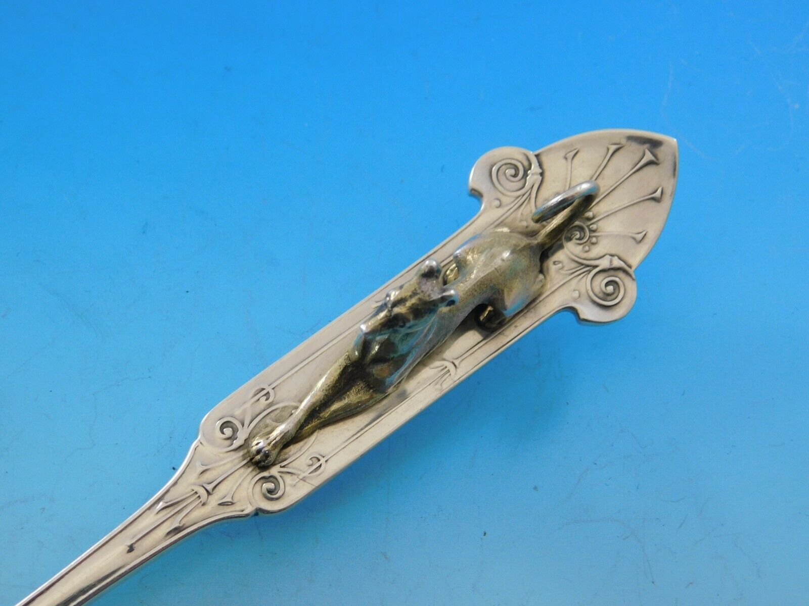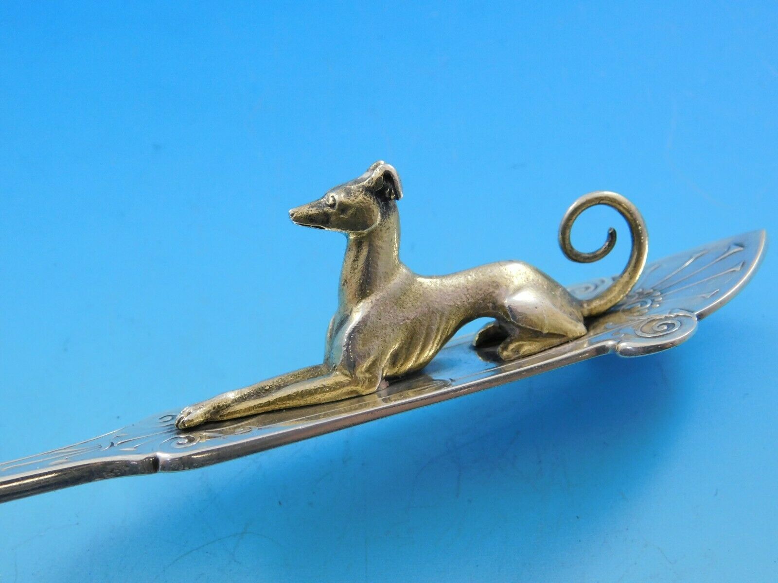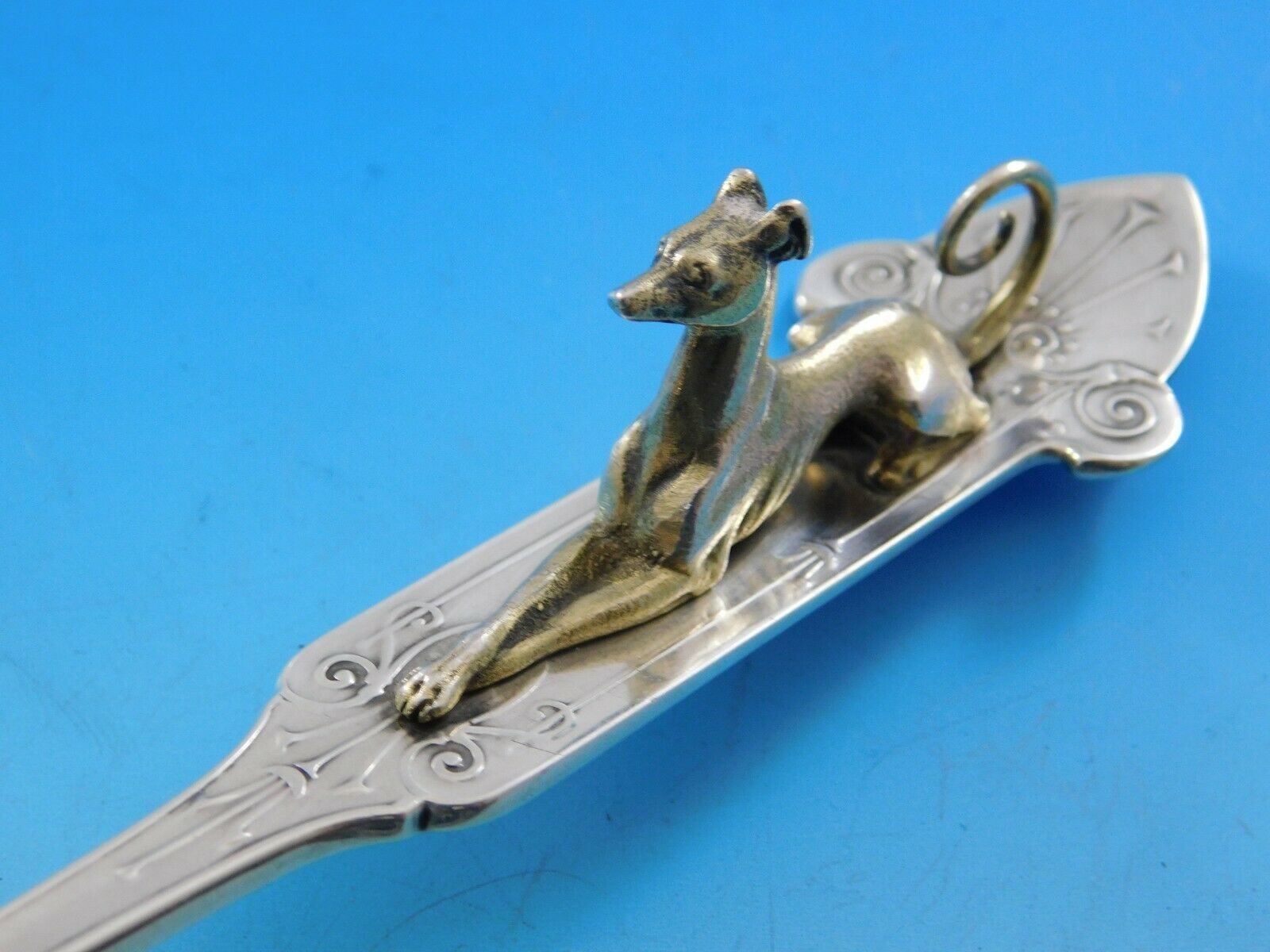 Sterling silver Berry Spoon with figural vermeil (completely gold washed) hound on the handle 9" in the pattern Hound by Gorham. It is monogrammed (see photos) and is in excellent condition. This is an extremely rare piece. Gorgeous!